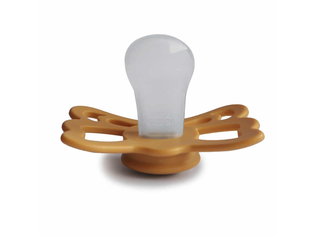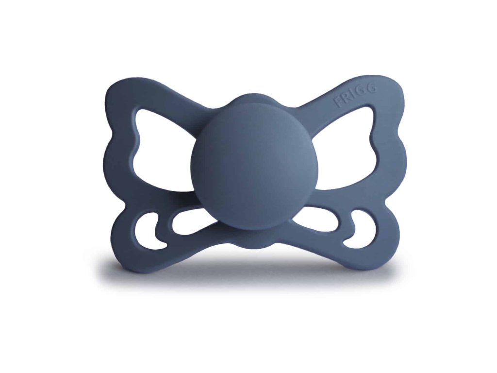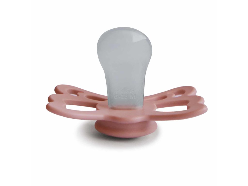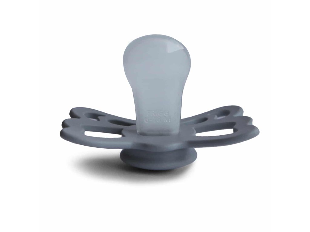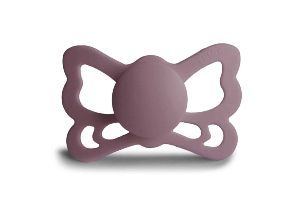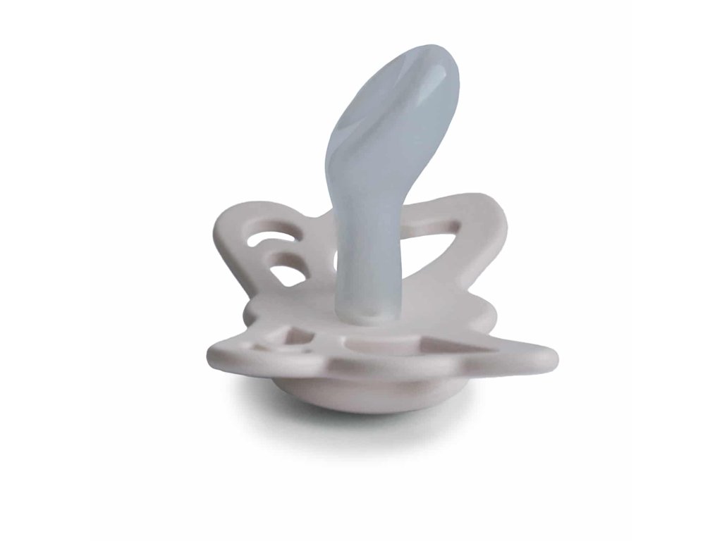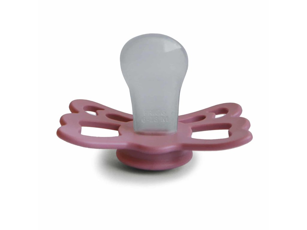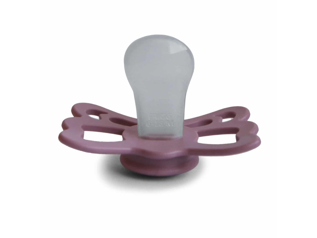 Tvar cumlíka FRIGG Butterfly pripomína motýľa. Štít so zvlnenými okrajmi má veľké vzduchové otvory pre väčšiu bezpečnosť a jeho okrúhly stred krásne zvýrazňuje eleganciu cumlíka.