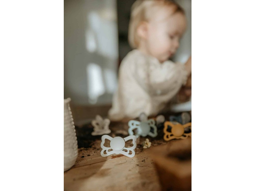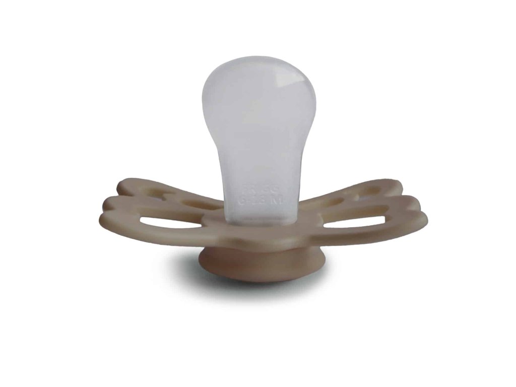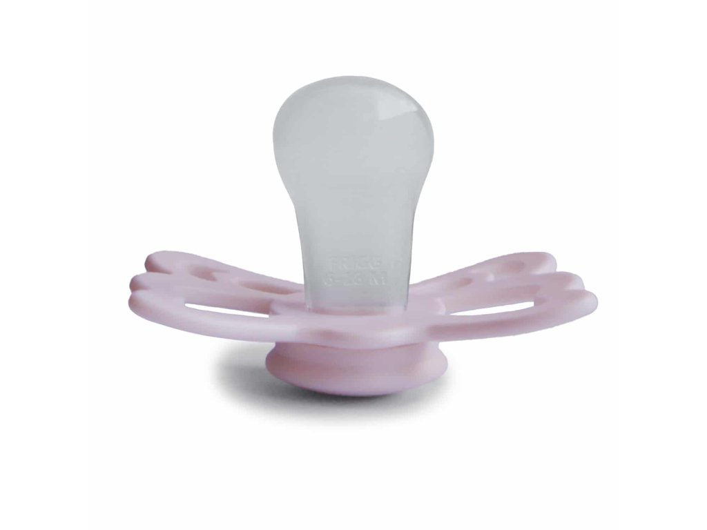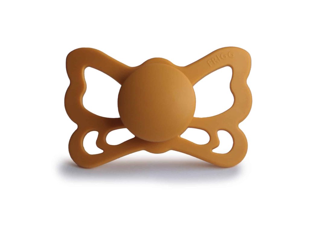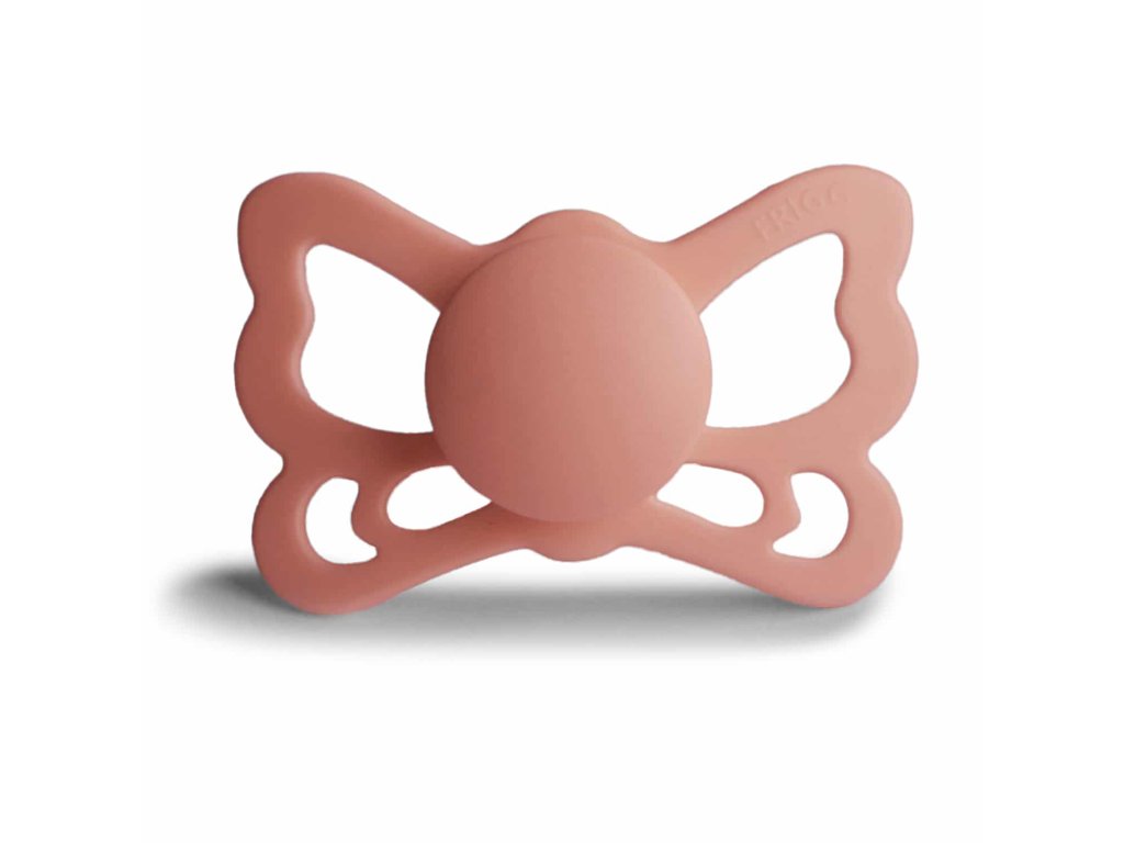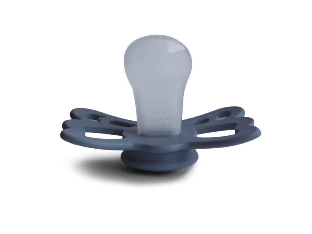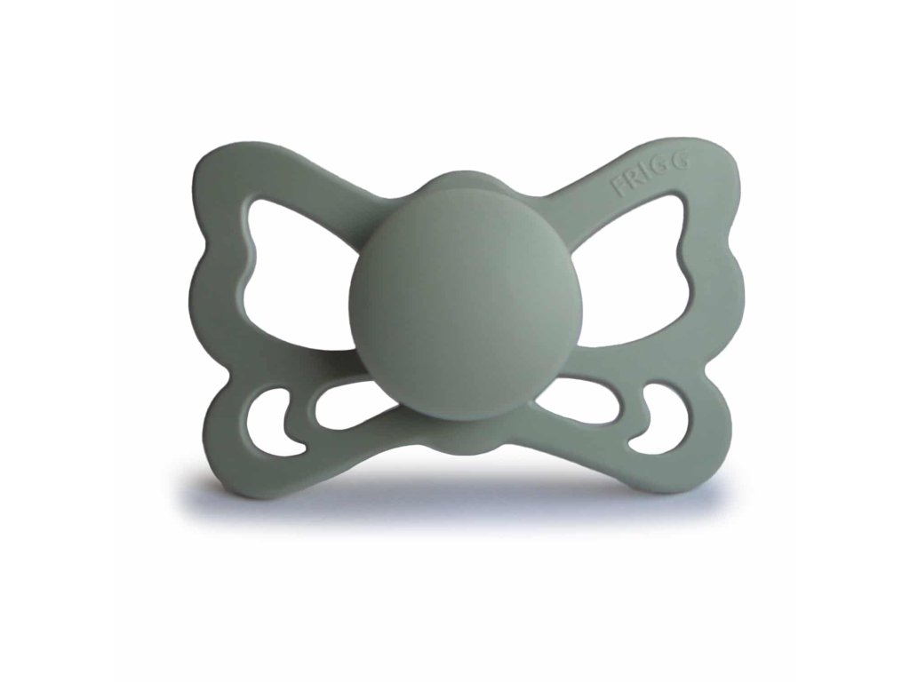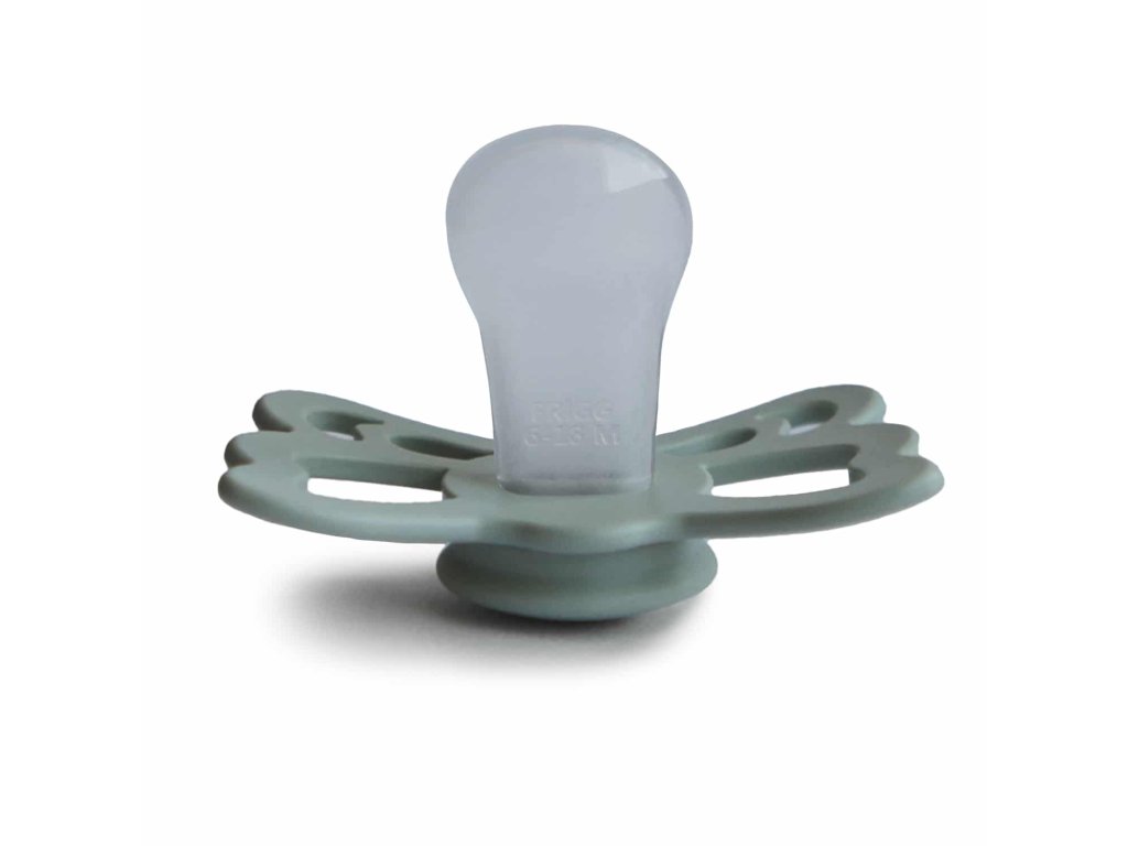 Tvar cumlíka FRIGG Butterfly pripomína motýľa. Štít so zvlnenými okrajmi má veľké vzduchové otvory pre väčšiu bezpečnosť a jeho okrúhly stred krásne zvýrazňuje eleganciu cumlíka.