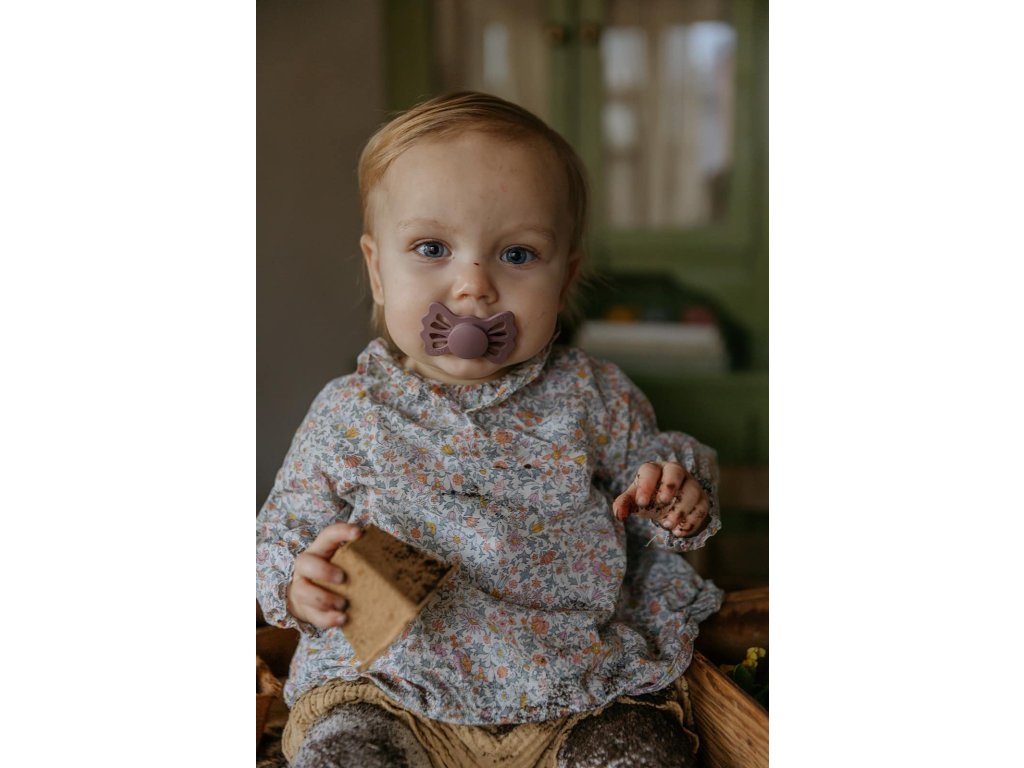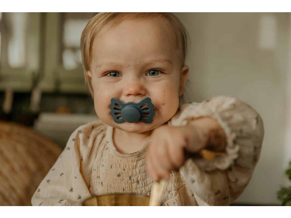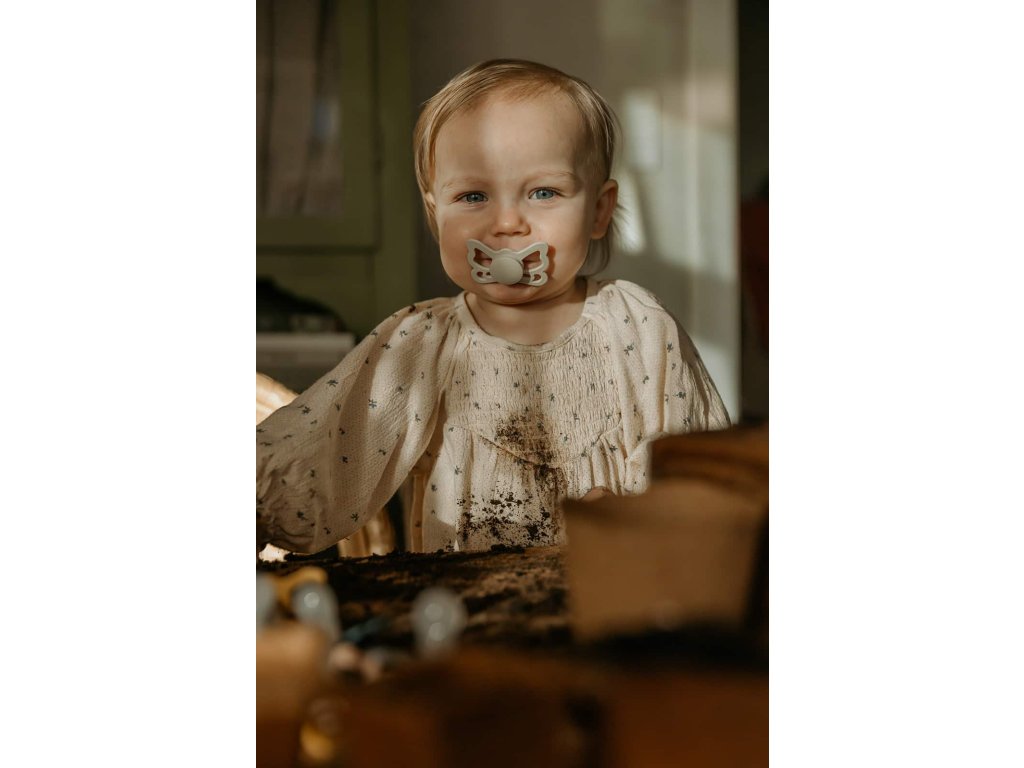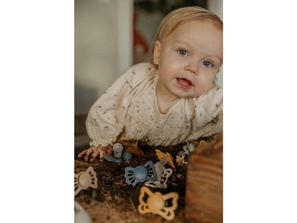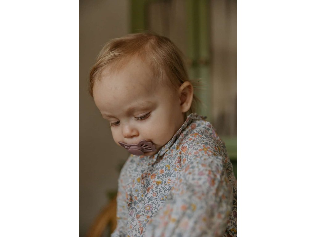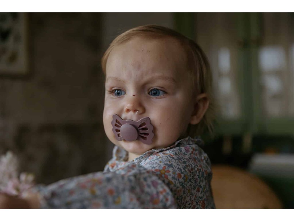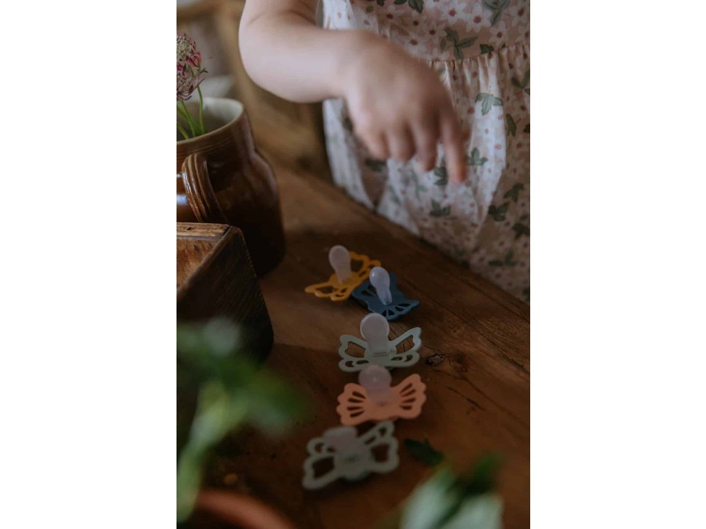 Tvar cumlíka FRIGG Butterfly pripomína motýľa. Štít so zvlnenými okrajmi má veľké vzduchové otvory pre väčšiu bezpečnosť a jeho okrúhly stred krásne zvýrazňuje eleganciu cumlíka.