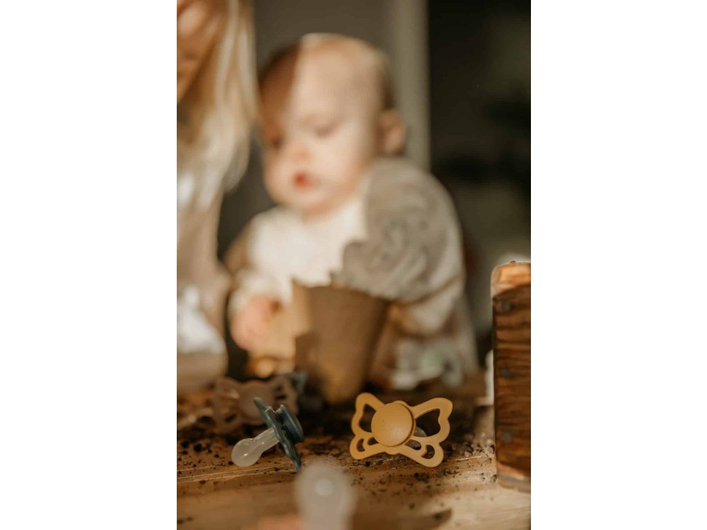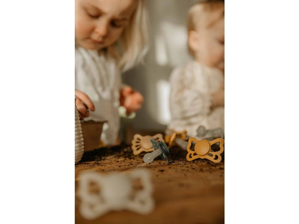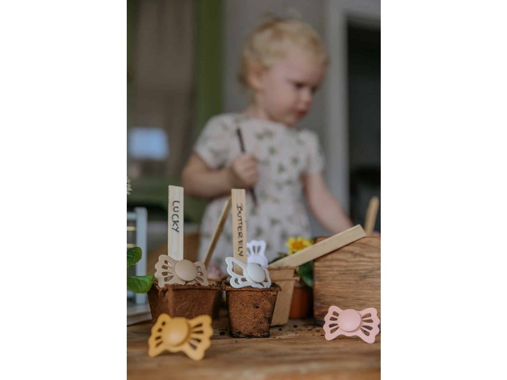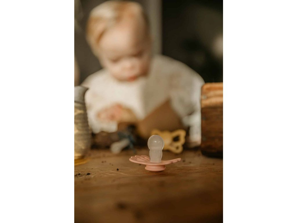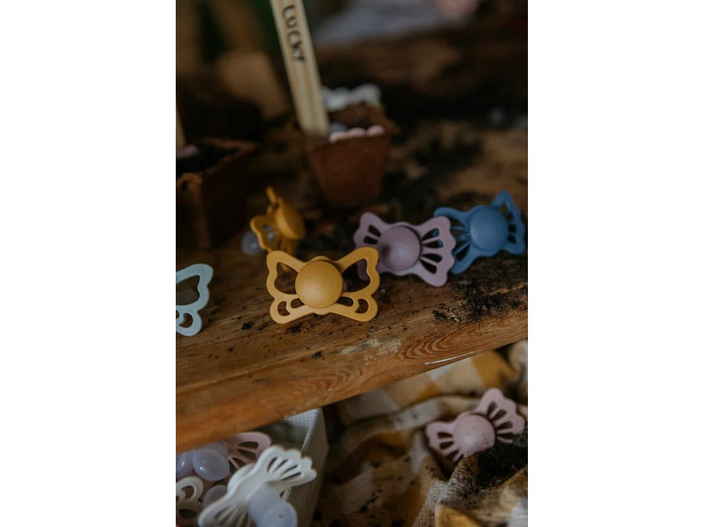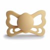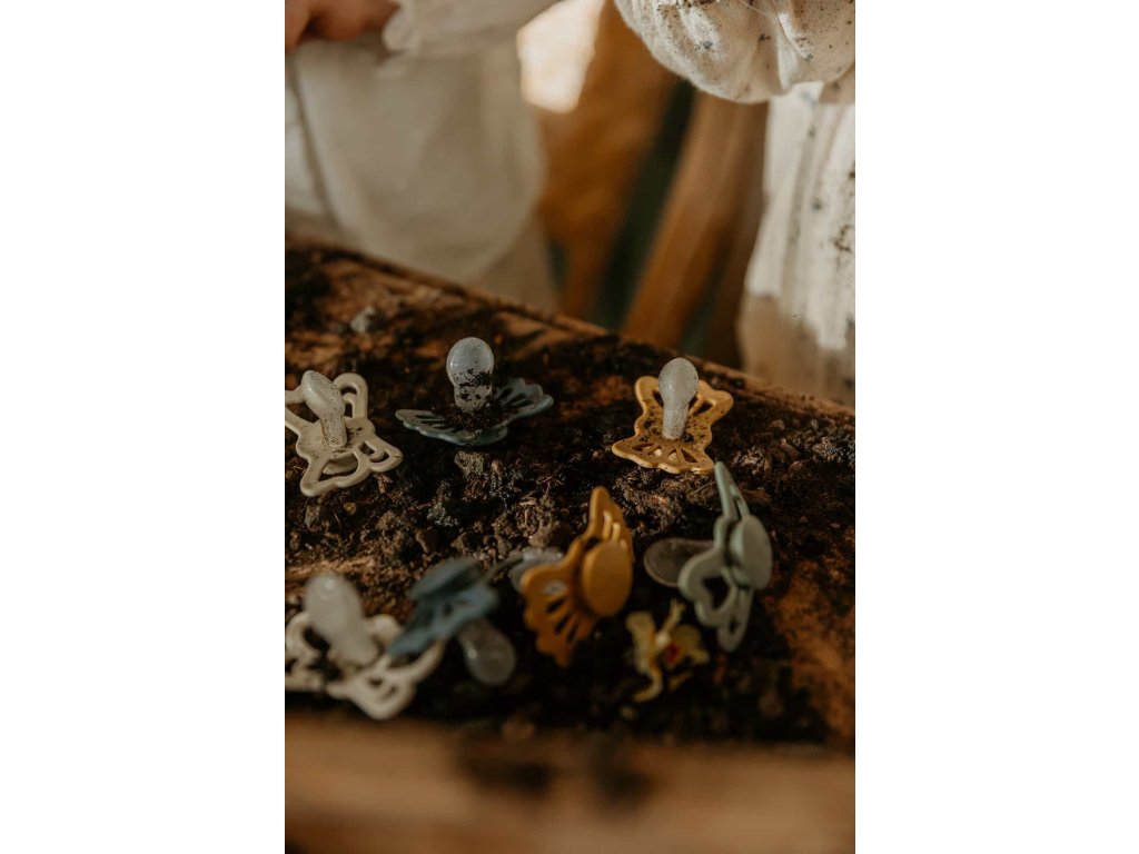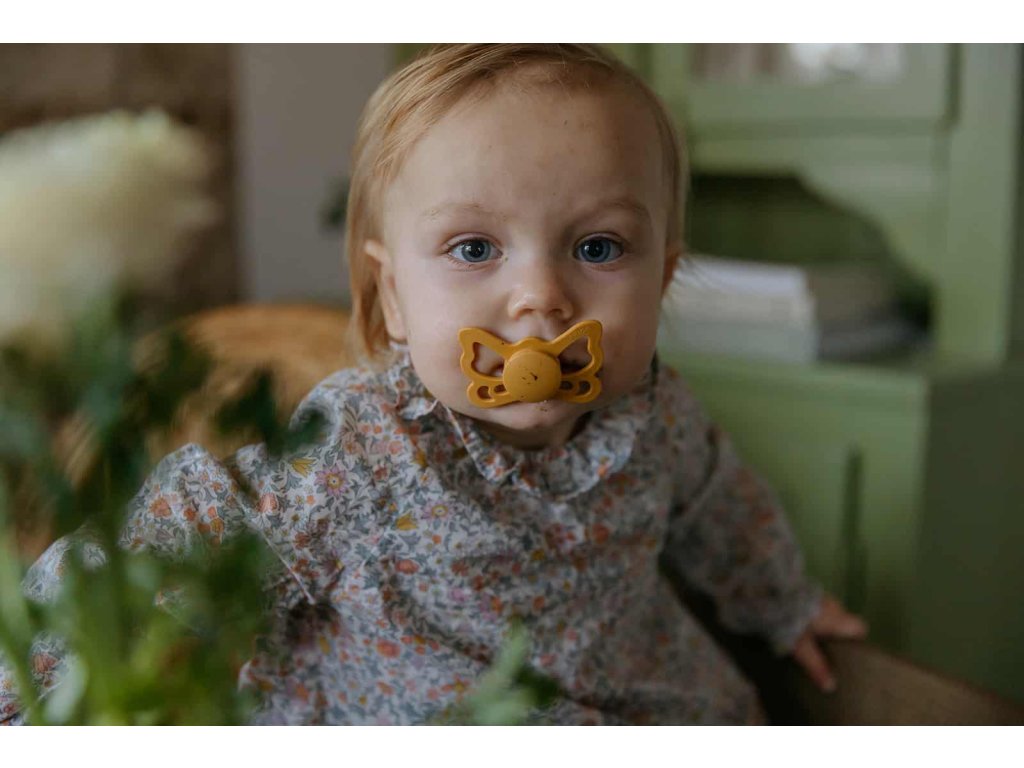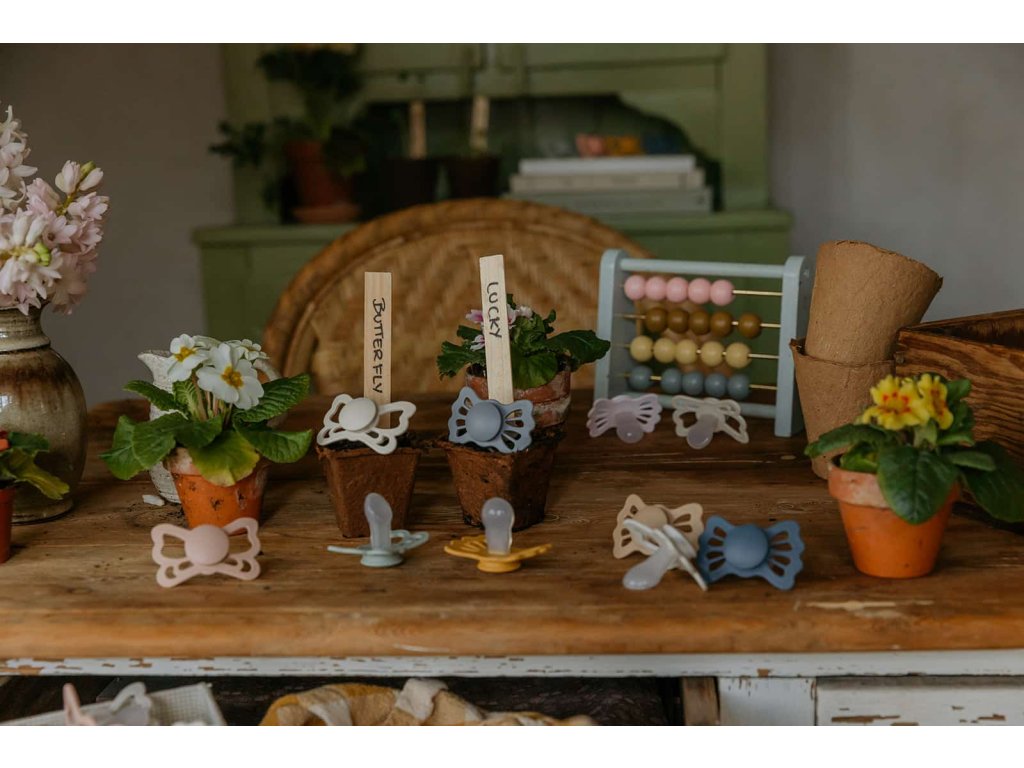 Tvar cumlíka FRIGG Butterfly pripomína motýľa. Štít so zvlnenými okrajmi má veľké vzduchové otvory pre väčšiu bezpečnosť a jeho okrúhly stred krásne zvýrazňuje eleganciu cumlíka.