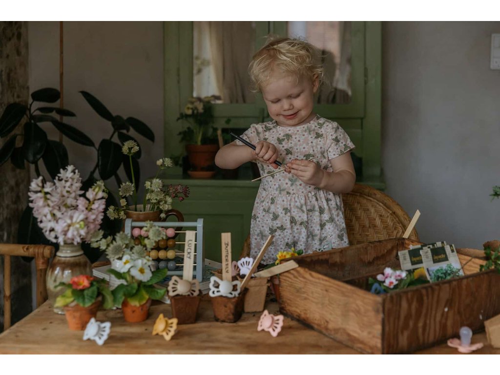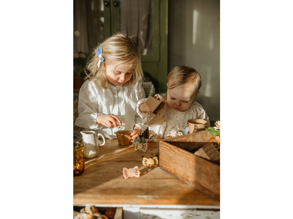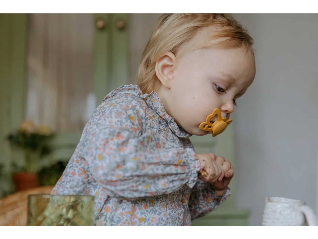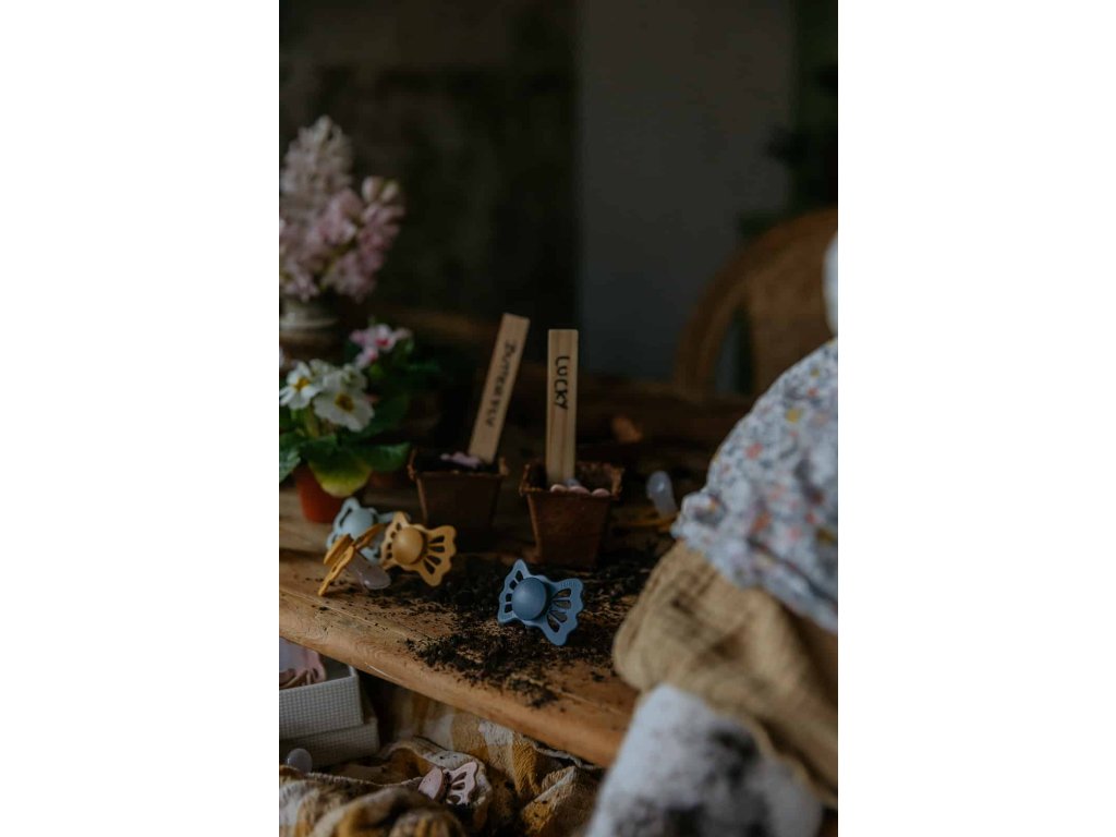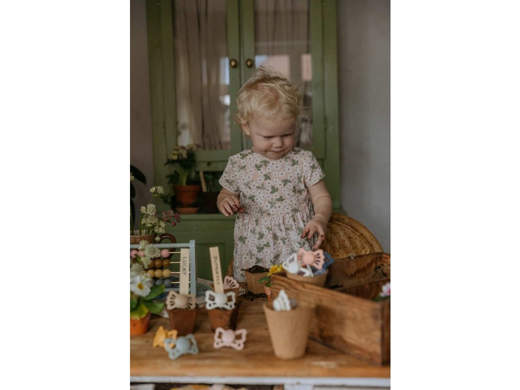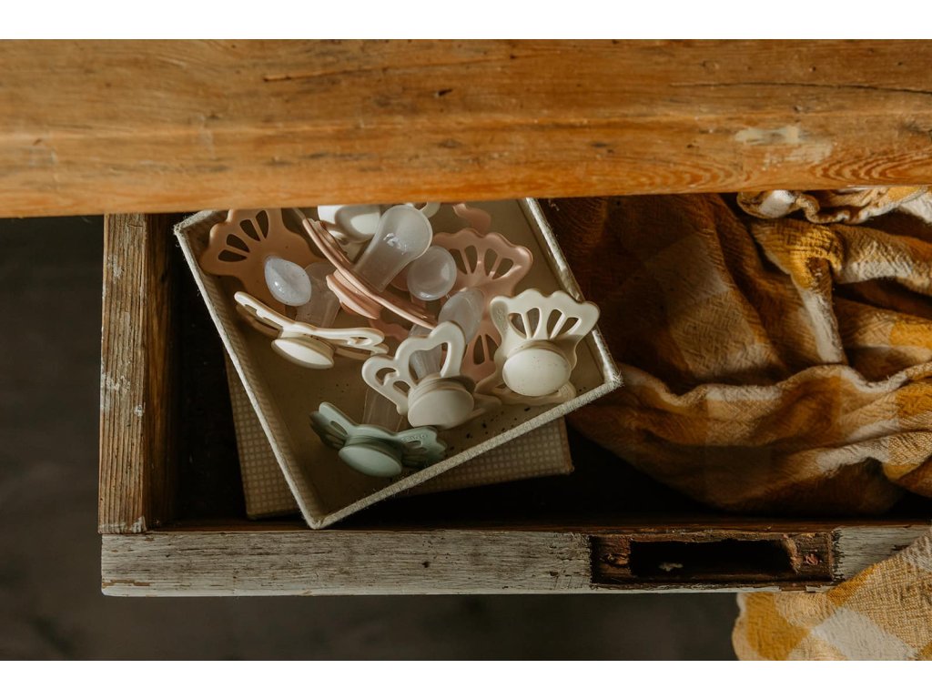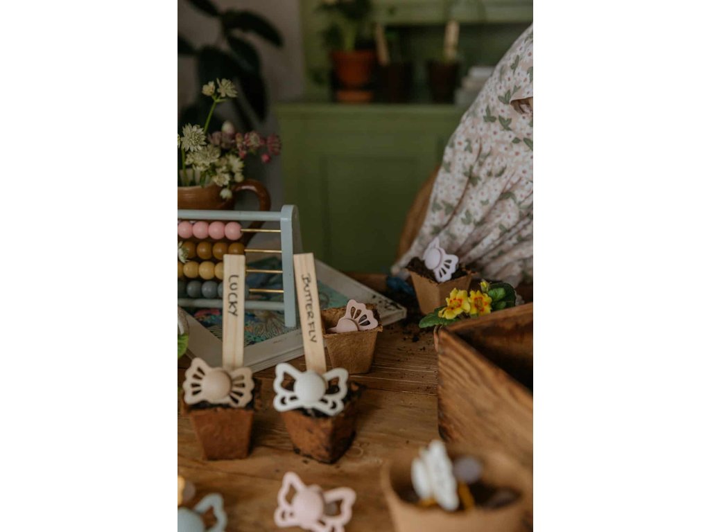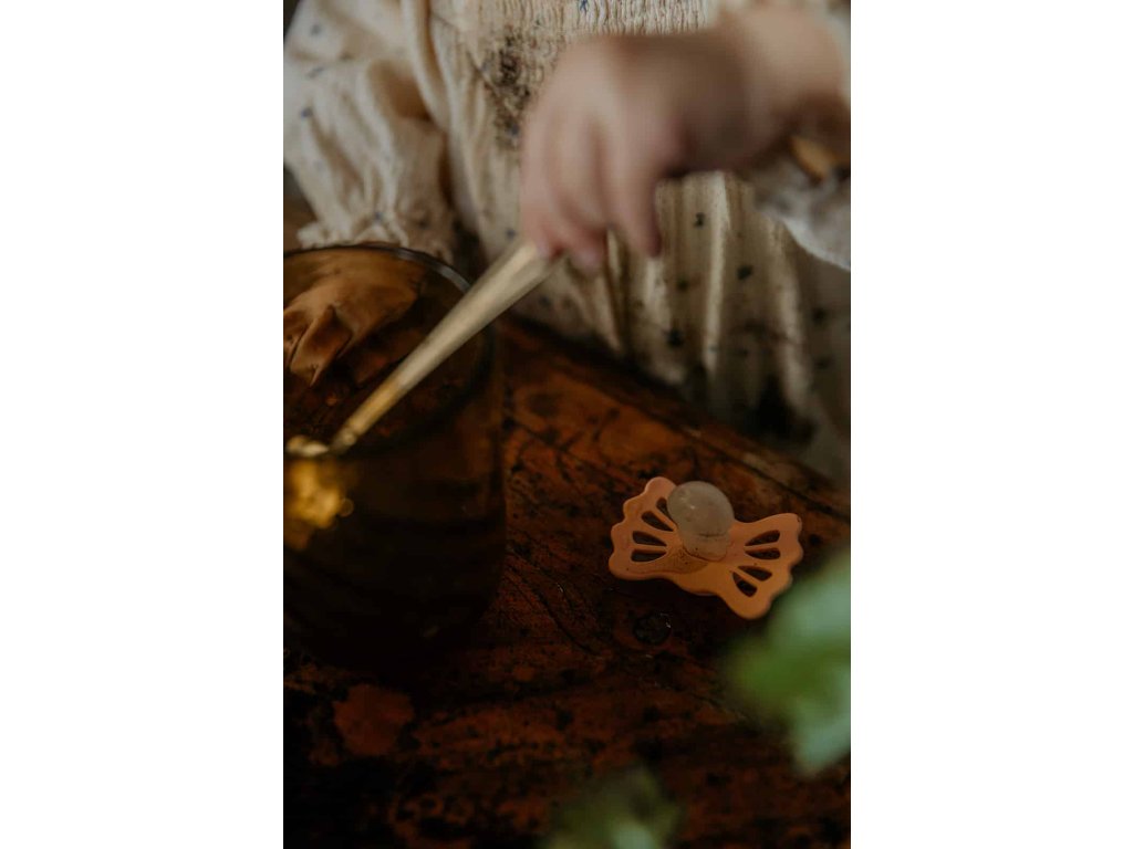 Tvar cumlíka FRIGG Butterfly pripomína motýľa. Štít so zvlnenými okrajmi má veľké vzduchové otvory pre väčšiu bezpečnosť a jeho okrúhly stred krásne zvýrazňuje eleganciu cumlíka.