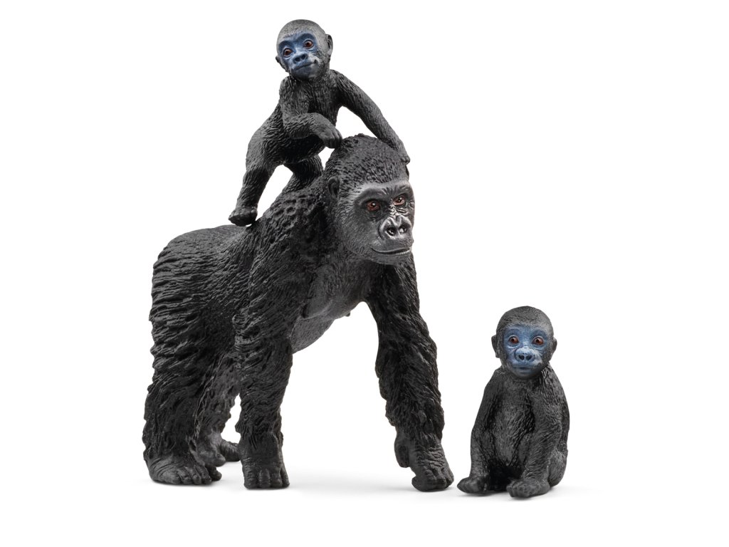 Gorila mama sa opiera o ruky, stojí vedľa svojich mláďat a pozorne ich stráži, aby vedela, že sú v bezpečí. Jedno z gorilích mláďat je najskôr ešte trochu unavené. Sedí na zemi a ospalo sa rozhliada. Možno by si chcelo trochu zdriemnuť. Jeho súrodenec je oveľa aktívnejší: snaží sa stáť, plazí sa po štyroch pralesom a dokonca vylezie na chrbát svojej mamy. S touto realistickou rodinou goríl nížinných si môžeš zahrať množstvo rôznych hier. Možno z tých roztomilých mláďat raz v tvojej herni vyrastú veľké gorily? Rozmery: 13,6x19,2x5,8cm. Vhodné pre deti od 3 rokov.