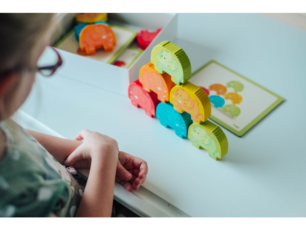 Motorická balančná hra – Sloníková veža je zábavná a poučná hračka pre deti od 2 rokov, ktorá rozvíja jemnú motoriku, koordináciu pohybov a trpezlivosť. Deti sa snažia poskladať sloníkov do veže tak, aby nespadli – podľa priložených šablón alebo vlastnej fantázie.