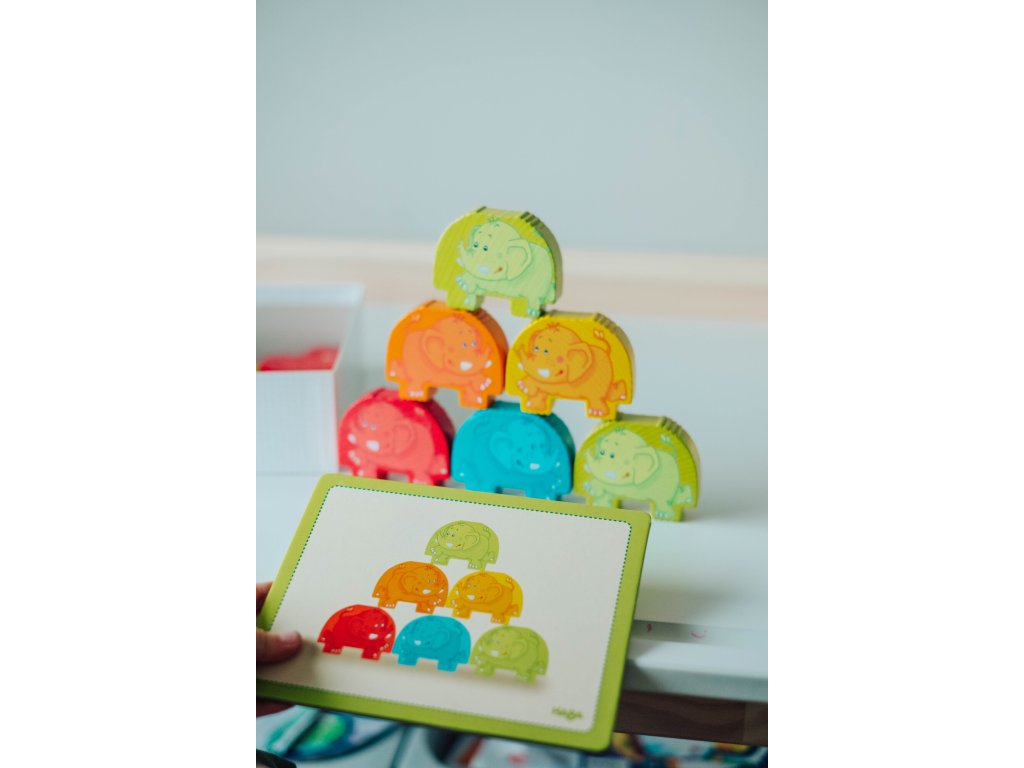 Hra obsahuje 10 roztomilých figúrok slonov vyrobených z kvalitného bukového dreva a 5 obojstranných kariet s rôznymi úrovňami obtiažnosti. Pri hraní si deti trénujú rovnováhu, koncentráciu aj predstavivosť.