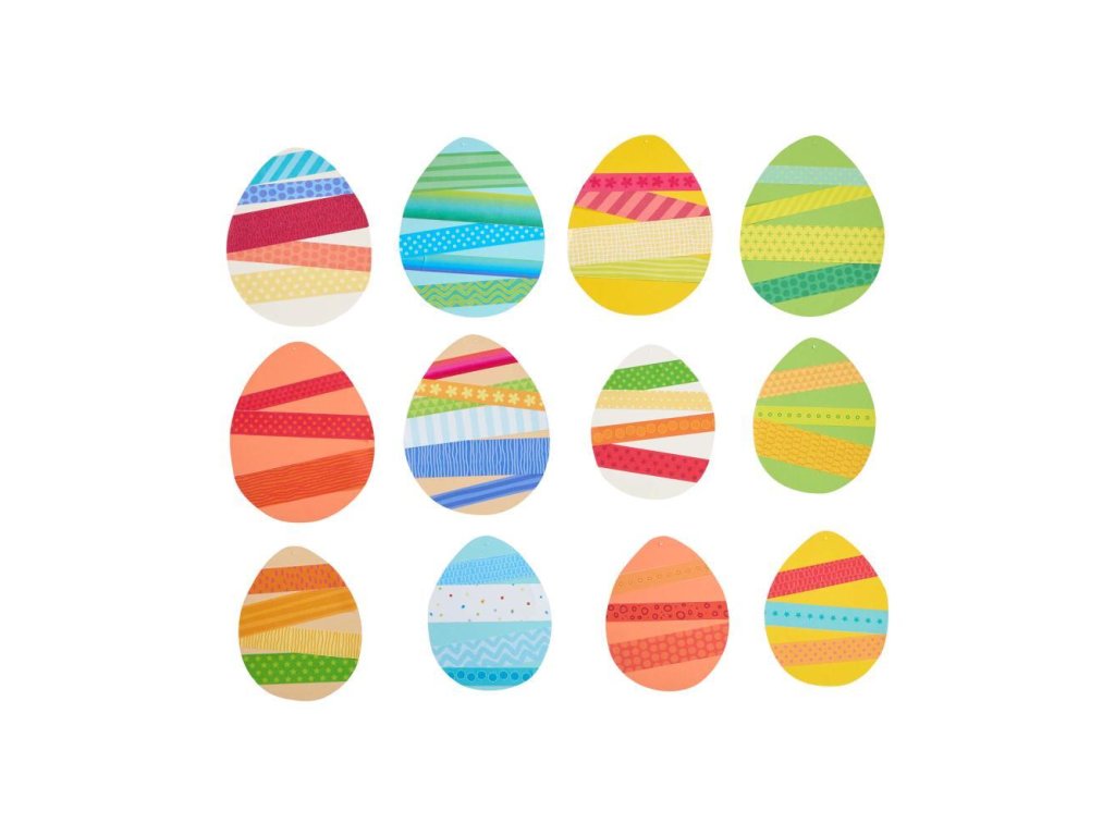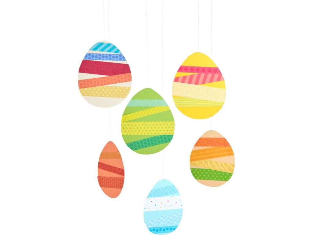 Jednoducho vystrihnite vajíčka vrátane ozdobných pásikov a potom ich ozdobte čo najkreatívnejšie. Vznikajú tak jednotlivé umelecké diela, ktoré nádherne upútajú na každom okne alebo veľkonočnom kríku.