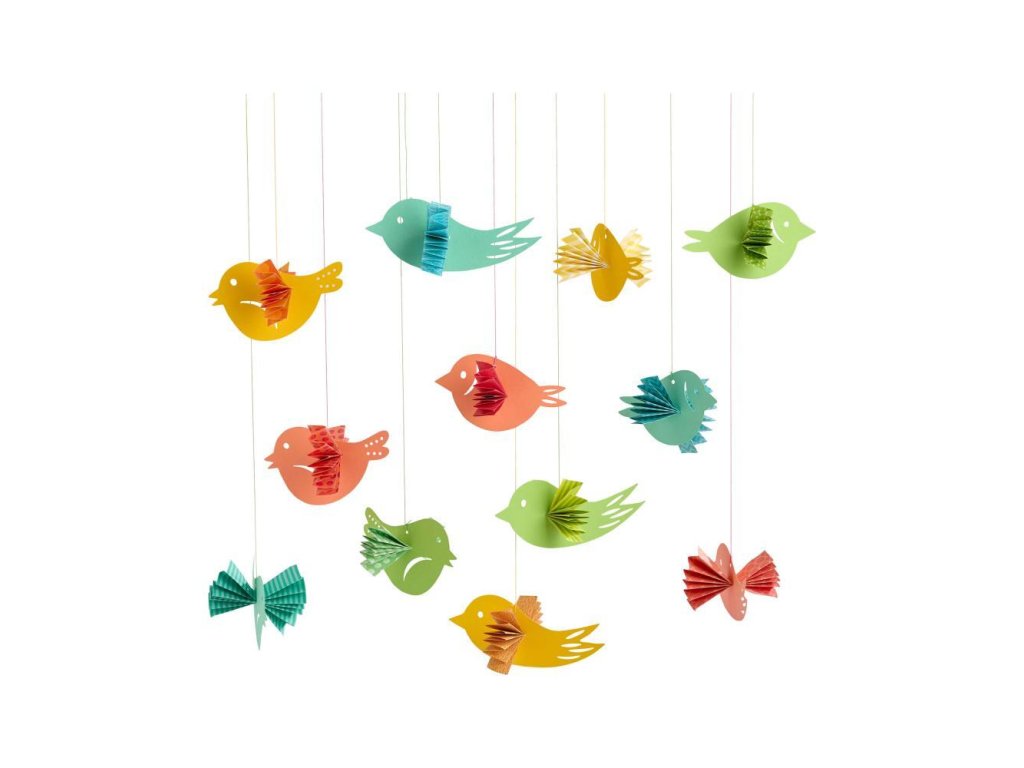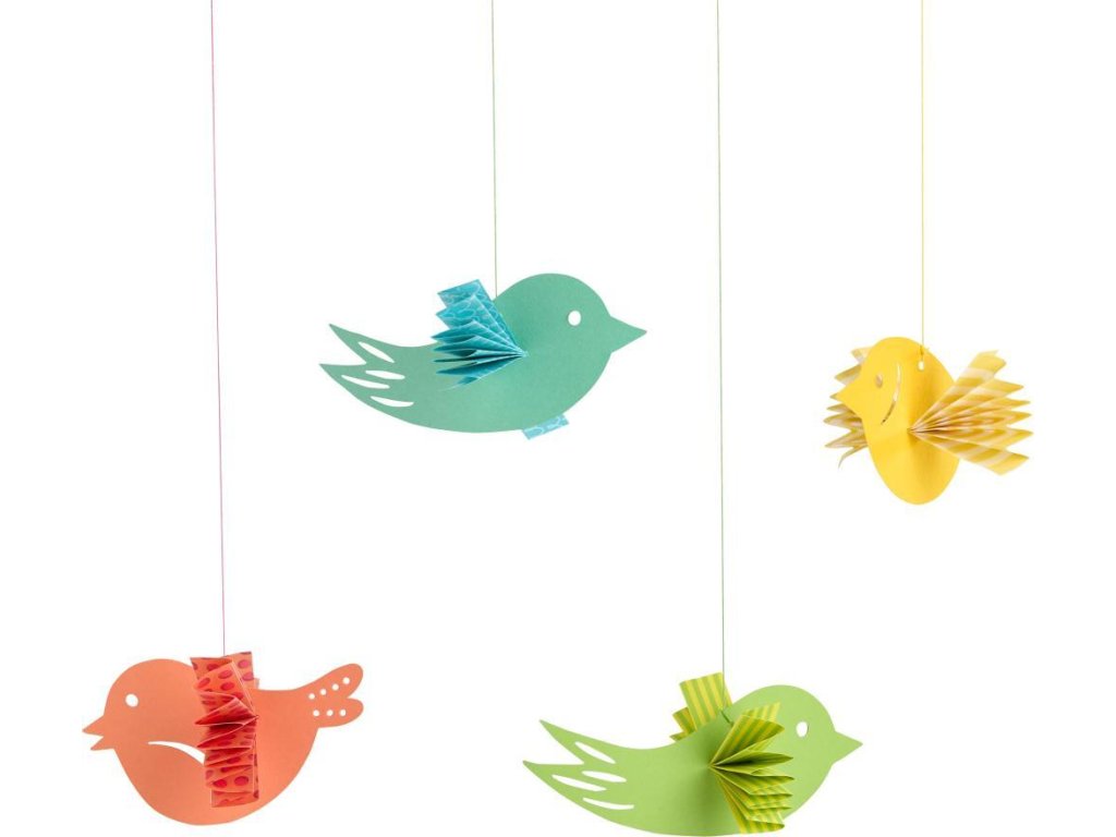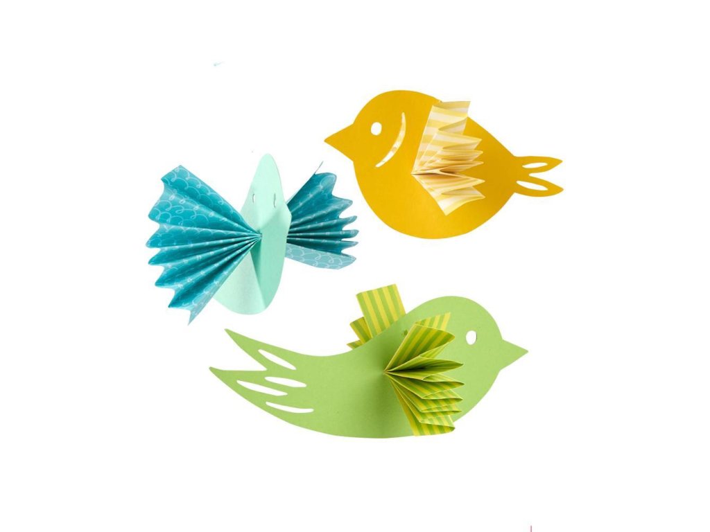 Jednoducho odstráňte vtáčiky z vopred narezaného fotografického kartónu a potom zložte farebné papierové listy pozdĺž čiar. Krídla sú vytvorené okamžite a ľahko sa prestrčia cez brucho vtáka a potom sa roztiahnu ako vejár. Dekorácia do každej miestnosti!