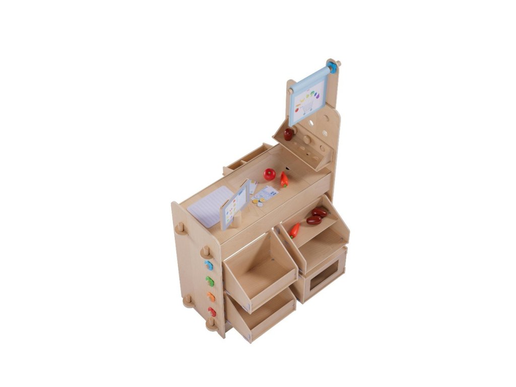 Obchod Play world: 1 nákupná sieťka, 5 nákupných tašiek, 1 paradajka, 2 mrkvy, 3 zemiaky, 25 mincí, 50 bankoviek, 1 EC karta, 1 pokladnička.