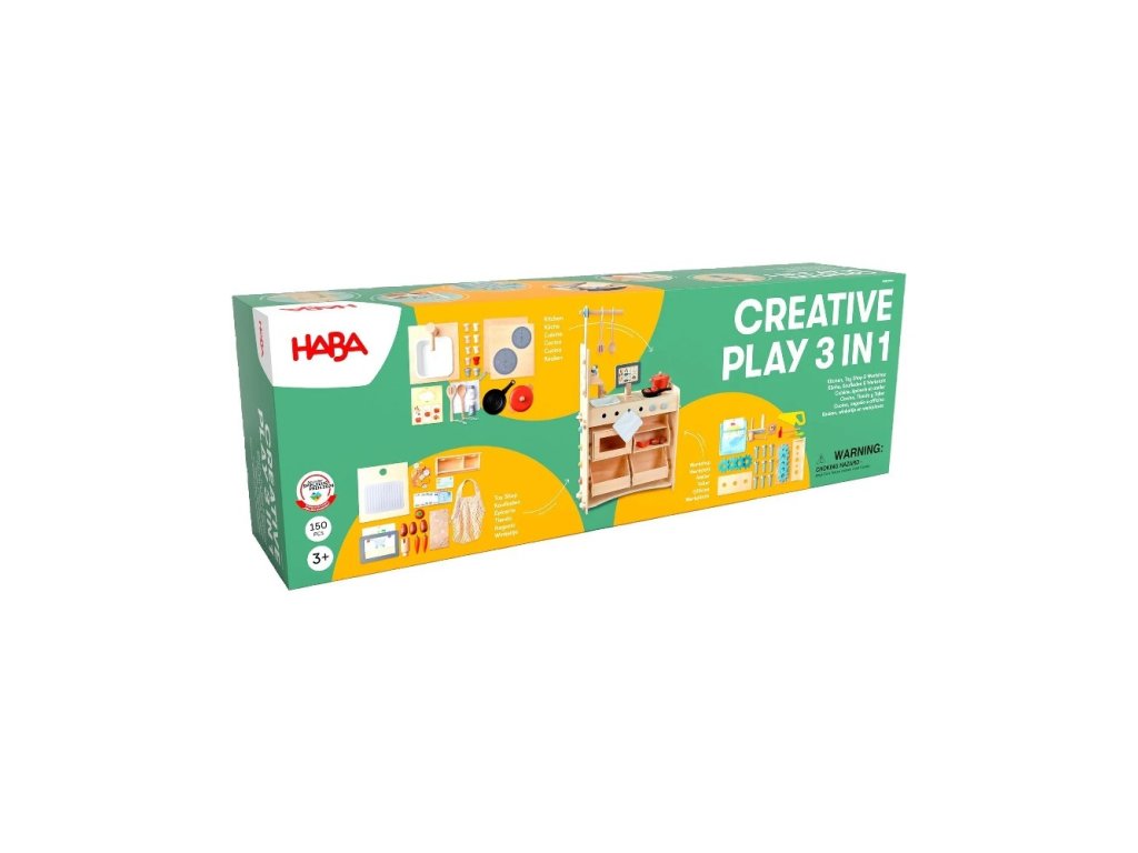 Dnes sa hrám na Michelinského kuchára, zajtra na obchod a pozajtra na dielňu! Transformovateľná hra Creative Play 3v1 kombinuje tri témy na hranie rolí a ponúka skvelú zábavu na najmenšom priestore! Modulárny herný systém umožňuje deťom úplne voľne vkĺznuť do rôznych rolí, pretože prestavbu je možné vykonať len v niekoľkých (detských) krokoch. Atraktívne a dobre premyslené vybavenie prináša do hry nekonečné možnosti hrania! Dodatočné sady na hranie rolí a príslušenstvo z radu hracích hier HABA umožňujú neustále rozširovanie hry Creative Play 3v1 v závislosti od záujmov a vývoja dieťaťa.