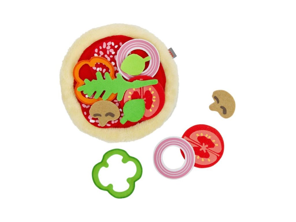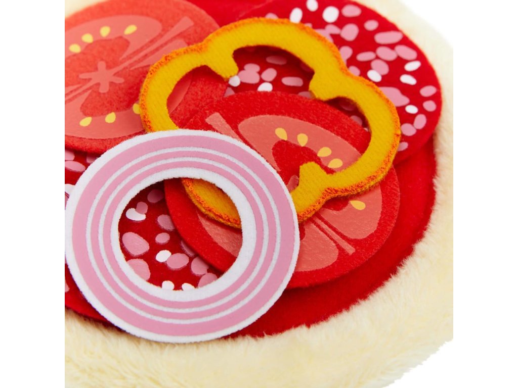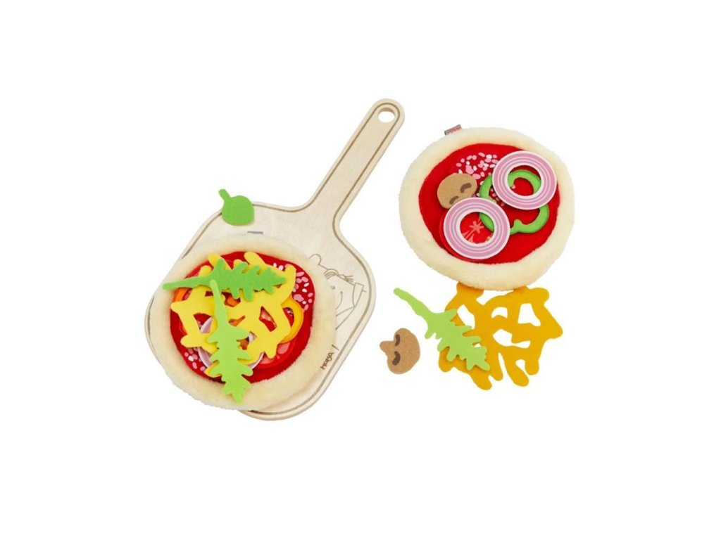 Obsahuje pevnú dosku na pizzu. Obsah: 2 základy na pizzu, 3 plátky salámy, 3 plátky paradajok, 3 lístky bazalky, 3 lístky rukoly, 3 kolieska cibule, 4 šampiňóny, 3 plátky papriky, 2 strúhaný syr, 1 šupka na pizzu. Ideálne pre kreatívne hranie rolí, láskyplne a realisticky navrhnutá hračka.