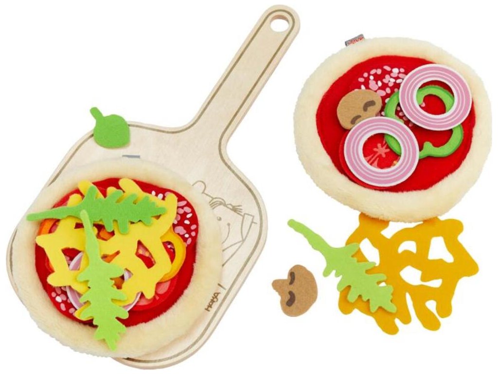 V Reštaurácii HABA môžu byť malí fanúšikovia pizze kreatívni: látkové pizze môžu byť jednoducho obložené rôznymi prísadami vyrobenými z pevnej plsti.