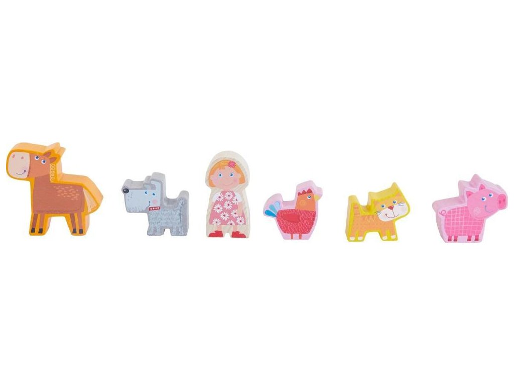 Drevená farma na hranie obsahuje dievča a chlapca (obojstranná figúrka), ako aj psa, mačku, koňa, kura a prasiatko na voľnú hru.