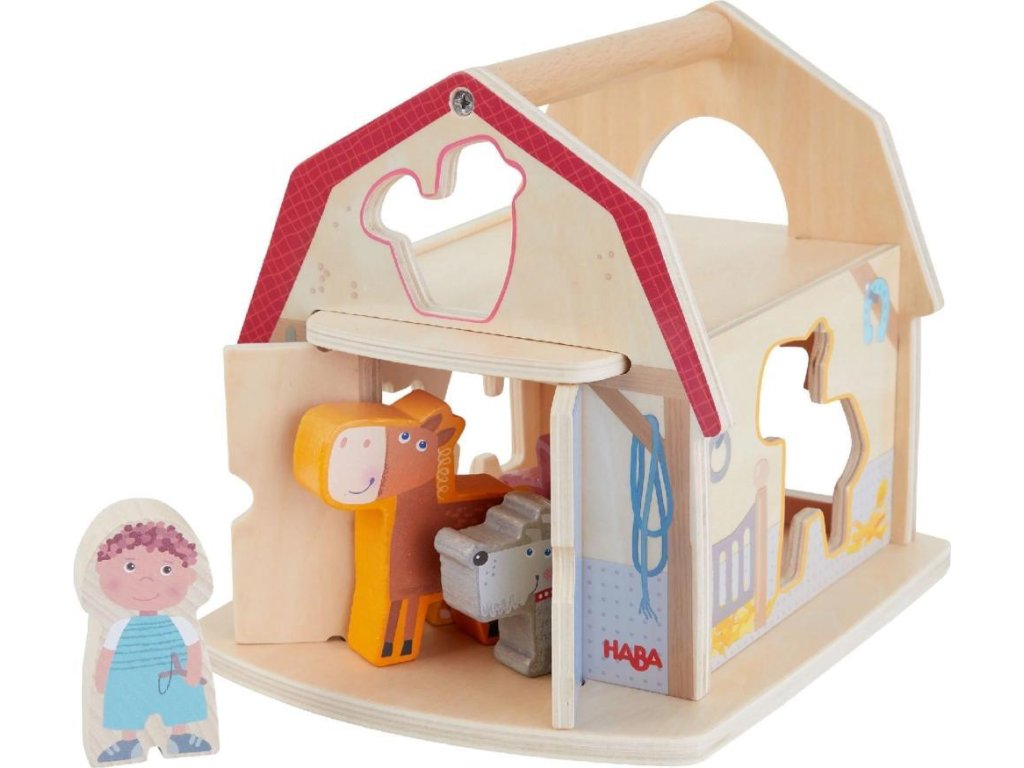 Zosúlaďovanie farieb a tvarov je skvelá zábava! Steny stodoly majú správny vchod pre každú figúrku. Aj prostredníctvom voľnej hry sa batoľatá zoznámia s hospodárskymi zvieratami a poskladajú ich na správne miesto v stajni. Drevené figúrky opäť vychádzajú cez pohyblivé dvere stodoly. Kompaktný drevený zásuvný domček možno ľahko prepravovať pomocou rukoväte.
