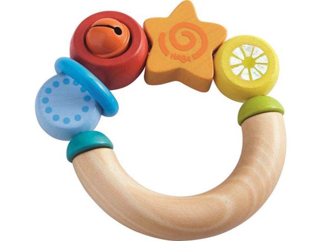 Farebné prvky uchopiteľnej hviezdy HABA sa vďaka elastickej páse pohybujú.