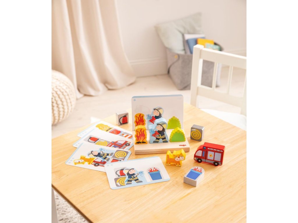 Hasiči boli privolaní a plamene už čoskoro zlikvidujú. Hasičov a rôzne ďalšie figúrky z miesta požiaru je možné naskladať a znova poskladať na základnú dosku.
