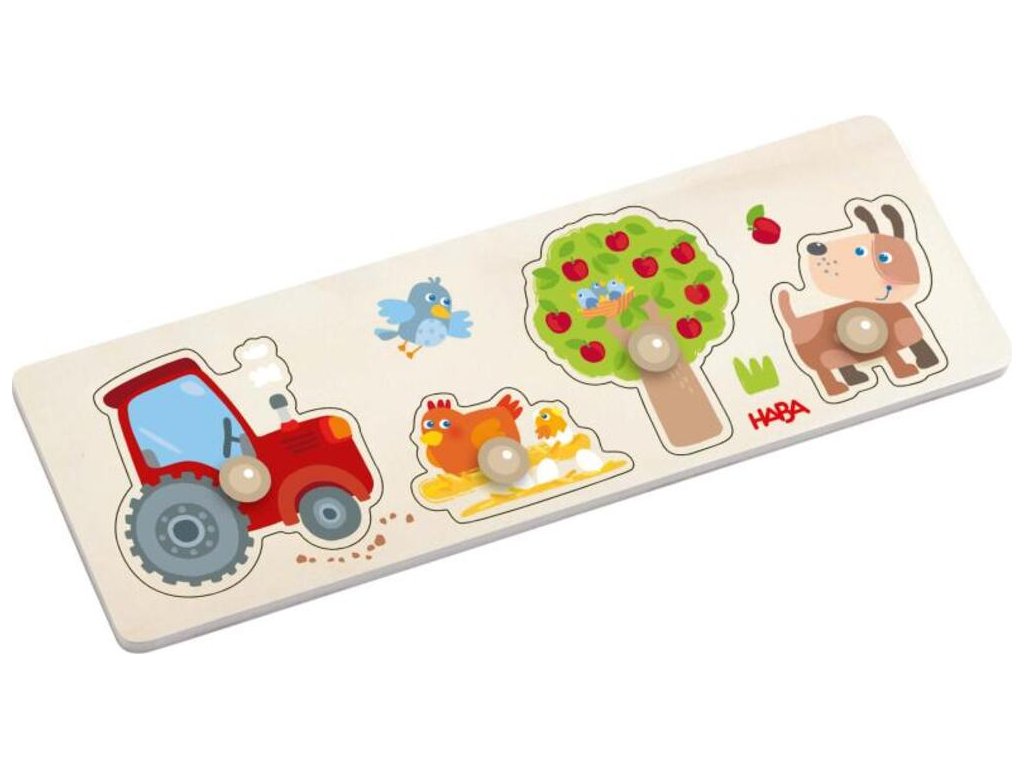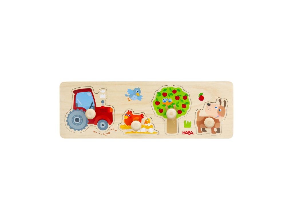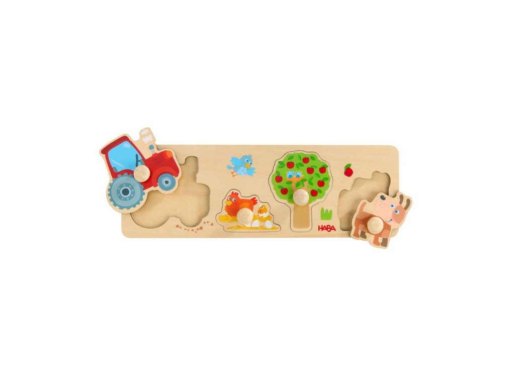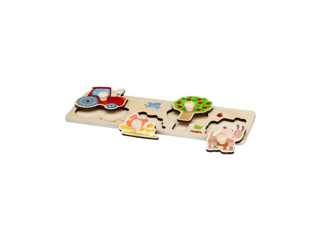 Každý dielik puzzle má svoje miesto... Kto dokáže správne priradiť traktor, jabloň atď. a umiestniť zodpovedajúce dieliky do výklenku? S veľkými prvkami s protišmykovými drevenými gombíkmi sa ľahko manipuluje, čo zaisťuje rýchly úspech puzzle.