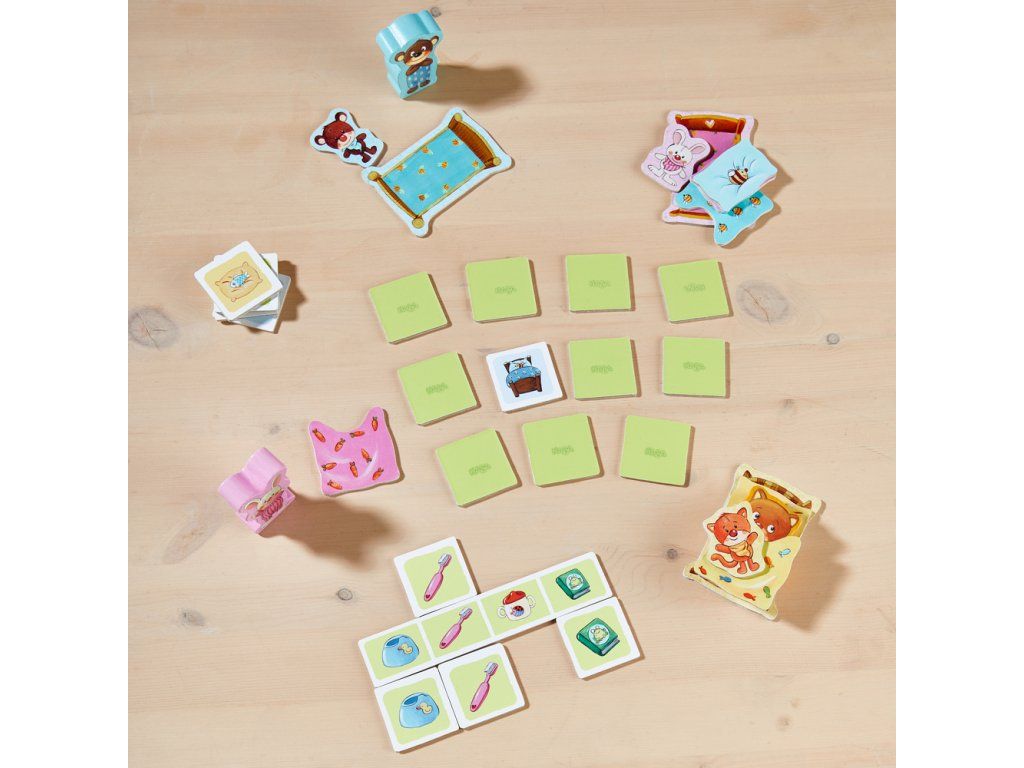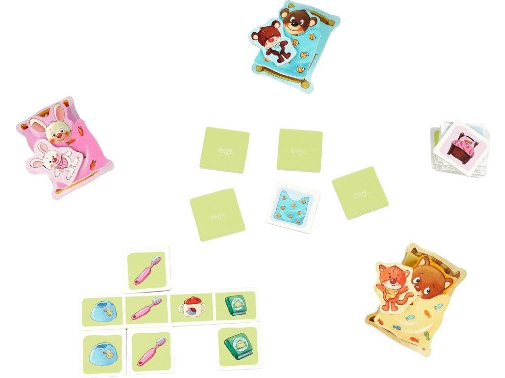 Hra obsahuje: 3 figúrky zvierat, 3 plyšové hračky, 3 postele, 3 vankúše, 3 prikrývky, 20 kartičiek, 1 tabuľka a pravidlá hry.