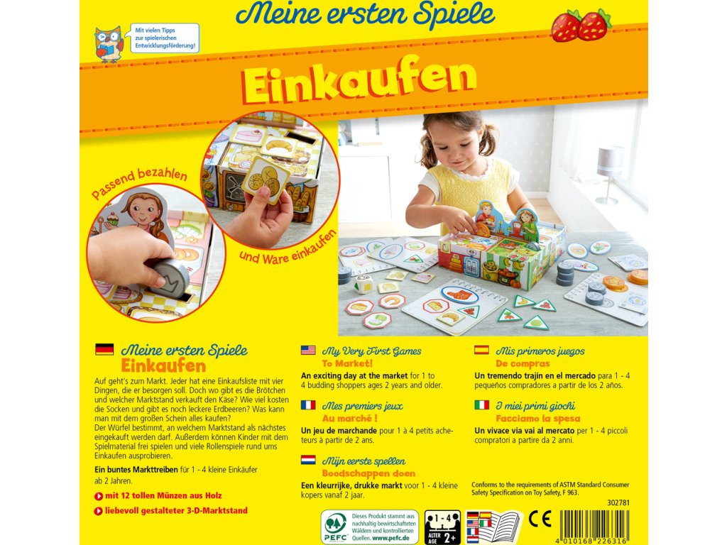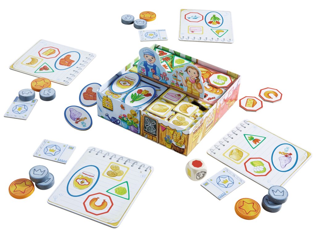 Obsah hry: 1 predajný stánok (spodný diel škatule s vložkou, hracou doskou a kulisami), 8 mincí s korunkou, 4 veľké mince s hviezdičkou, 4 HABA detské bankovky, 16 dielikov s tovarom v 4 kategóriách, 4 nákupné zoznamy, 1 kocka, 1 pravidlá.