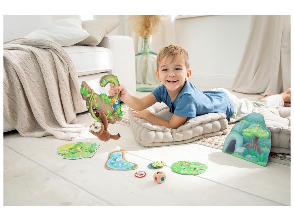 Zvedavý malý leňoch, obklopený sviežimi zelenými rastlinami a lahodným ovocím, chce preskúmať džungľu. Zvyčajne sa pohybujú dosť pomaly – ale potom môžu náhle veľmi rýchlo zmiznúť!