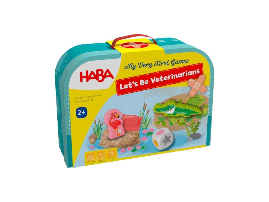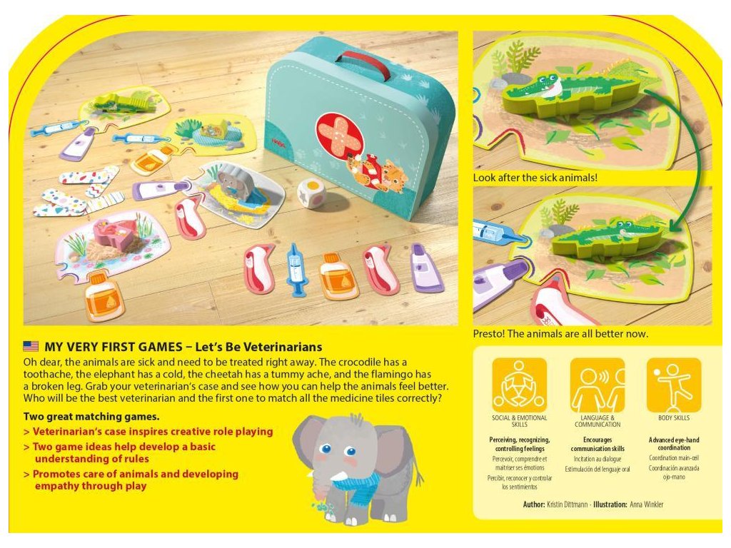 4 zvieratá: Gepard, krokodíl, slon a plameniak, z ktorých každý má jedinečné choroby.1 kocka: Používa sa na určovanie akcií v hre a pridáva vrstvu náhodnosti, aby hra zostala vzrušujúca.4 miesta na spanie: Útulné miesta pre každé zviera na odpočinok, kým sa zotaví zo svojho utrpenia.12 liečivých dlaždíc: Obsahuje predmety ako sirup na horúčku, injekčnú striekačku, vyhrievaciu podložku a teplomer na liečbu rôznych stavov zvierat.5 Komfortných náplastí: Na upokojenie zvierat po ošetrení.Pokyny pre hru: Obsahuje dva nápady na hry v úvodnej sade pravidiel, ktoré odštartujú zábavu a učenie.Hrajte a učte sa: „Moje prvé hry: Vet“ nie je len o zábave; je to tiež skúsenosť s učením. Hra povzbudzuje malé deti, aby sa naučili starať sa o zvieratá a hravou a prístupnou formou im predstaví základnú zdravotnú starostlivosť. Súčasťou je aj lekárska taška na podporu tvorivého hrania rolí, ktorá zvyšuje predstavivosť a empatiu.