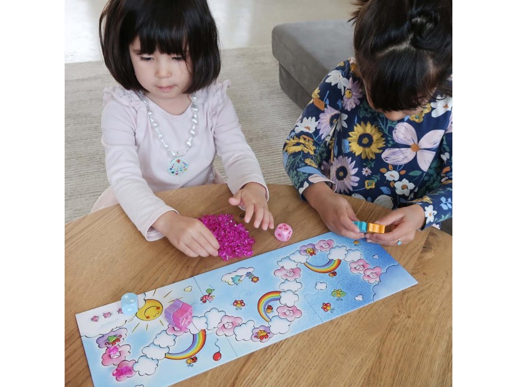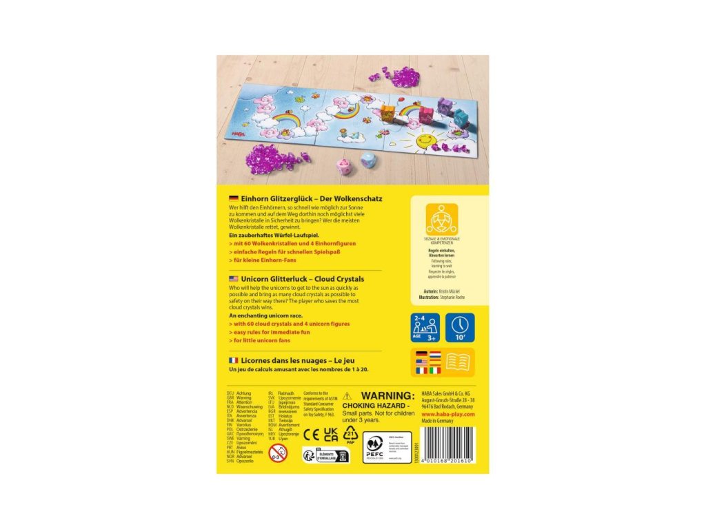 Štyri jednorožce Glitterluck, Stardust, Wonderflower a Magicwhirl žijú v ďalekej krajine oblakov a sú najlepšími priateľmi. Bujaro cválajú po mäkkých bavlnených obláčikoch, šmýkajú sa po farebných dúhách alebo sa hrajú s trblietavými ružovými oblačnými kryštálmi. Zrazu prichádza búrka! Jednorožce rýchlo utekajú pred tmavými mrakmi smerom k slnku. Cestou tam chcú pred búrkou doniesť do bezpečia čo najviac oblačných kryštálov. Ktoré dieťa môže pomôcť svojmu jednorožcovi? Jednoduché pravidlá sú rýchlo prečítané a hra s kockou sa môže začať. Kto sa so svojou figúrkou jednorožca dostane k slnečnému mraku ako prvý a nazbiera najviac kryštálov oblakov, môže vyhrať túto s láskou navrhnutú hru. Obsah: