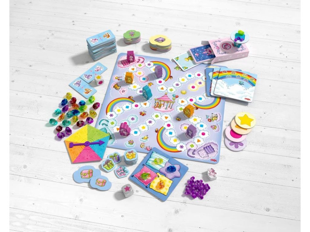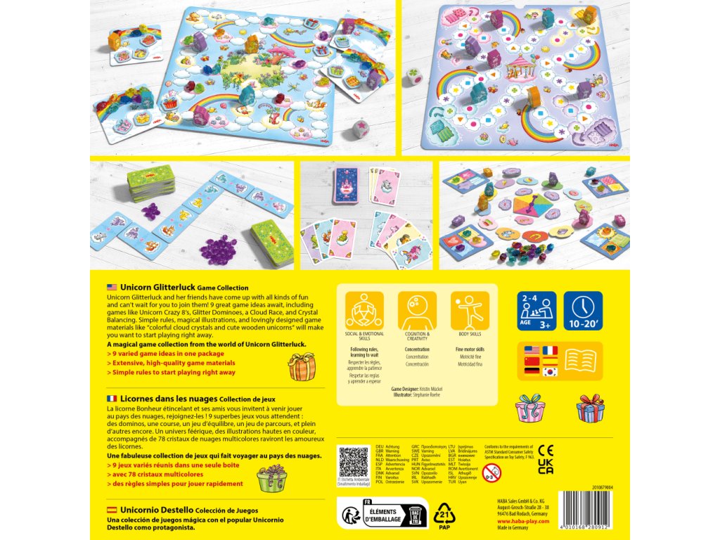 Vo svete Zázračných jednorožcov sa toho vždy veľa deje. Glitterluck, Stardust, Marvel Flower a Magic Swirl sú 4 jednorožce , ktoré spoločne zažívajú každý deň vzrušujúce dobrodružstvá. Pridajte sa k nim a nechajte sa očariť magickou hrou! 1. All around the Cloud Land Vzrušujúce preteky v kocky pre 2 až 4 deti vo veku od 3 rokov. Pečie niekto? Z oblakovej krajiny sa nesie lahodná vôňa čerstvých muffinov. Nechajte svojho jednorožca a zajačika behať po pavilóne. Ten, kto ako prvý dostane svoje hracie figúrky na oblaky ich farby, dostane chutné maškrty! 2. Všetky farby dúhy Zábavná zberateľská hra pre 2 až 4 deti vo veku od 4 rokov. Aké šťastie – darčeky a dúhy v jeden deň! Rozdávanie darčekov je zábava, preto dajte nejaké darčeky svojim priateľom a zároveň zbierajte cenné oblačné kryštály v 7 farbách dúhy. Kto ako prvý rozdá všetky svoje dary a nazbiera 7 rôznofarebných kryštálov pre vlastnú dúhu? 3. Trblietavé domino Čarovná aranžovacia hra pre 2 až 4 deti vo veku od 3 rokov. Dnes je v Cloud Land príjemný deň. Položte dlaždice vedľa zodpovedajúcich obrázkov, vytvorte rad a za odmenu zbierajte kryštály z oblakov. Kto bude mať na konci najviac kryštálov? 4. Cloud Swirl Domino Všestranná čarovná aranžovacia hra pre 2 až 4 deti vo veku od 4 rokov. Hej, toto je zábava! Unicorn Glitterluck a jej priatelia sa hrajú na skrývačku. Dobre si všimnite, kto čo skrýva za každým z 5 malých obláčikov okolo gramofónu a rýchlo klepnite na správny predmet priateľa. Kto prvý správne uhádne, dostane ako odmenu oblačný kryštál. Kto nazbiera najviac kryštálov? 5. Pamäťová hra na schovávačku Rýchlopaľové pexeso pre 2 až 4 deti vo veku od 5 rokov. Oh, chlapče, toto je zábava! Unicorn Glitterluck a jej priatelia sa hrajú na skrývačku. Musíte si zapamätať, kto sa skrýva za 5 obláčikmi okolo rotačky a rýchlo uhádnuť správneho kamaráta. Prvý hráč, ktorý správne uhádne, získa ako odmenu oblačný kryštál. Kto nazbiera najviac kryštálov? 6. Cloud Race Memory Game Preteky so sladkou pamäťou pre 2 až 4 deti vo veku od 3 rokov. Fuh – jednorožce sa celý deň hrali v Cloud Land. Ale kam zmizli ich hračky? Pomôžte im nájsť! Kto nájde hľadaný predmet, dostane ako odmenu darček. Kto môže vyzbierať požadovaný počet darčekov ako prvý? 7. Cloud Crystal Balancing Kolísavá šikovnosť hra pre 2 až 4 deti vo veku od 5 rokov. Ach, drahá, to je vratké! Malý zajačik a Rosalie chcú nosiť na svojich podnosoch čo najviac oblačných kryštálov. Podarí sa im to? Komu sa podarí umiestniť všetky svoje kryštály na podnosy bez toho, aby spadli? 8. Bláznivé osmičky Unicorn Farebná kartová hra pre 2 až 4 deti vo veku od 4 rokov. Aj v Oblačnej krajine občas prší. Čo robia jednorožce v daždi? Správne, hrajú Crazy Eights. Mali by ste hrať tiež! Hru vyhráva hráč, ktorý ako prvý vyloží všetky svoje karty. 9. Kartová hra Unicorn Zábavná kartová hra pre 2 až 4 deti vo veku od 5 rokov. Unicorn Glitterluck a jej priatelia zažili veľa dobrodružstiev. Dnes sa pozerajú na fotky. Ktoré však patria k sebe? Nájdite zodpovedajúce obrázky a položte ich správne. Hráč, ktorý odvedie najlepšiu prácu, dostane ako odmenu darček. Hru vyhráva hráč, ktorý ako prvý nazbiera 2 darčeky.