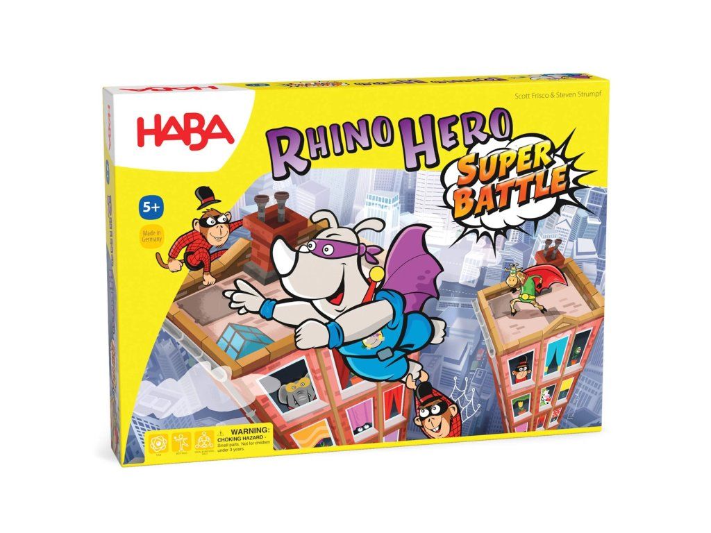 Rhino Hero je späť v práci! A tentoraz nielenže treba vyliezť na vratký mrakodrap, ale čakajú vás aj zúrivé bitky medzi štyrmi superhrdinami: samotným Rhino Hero a tromi novými prírastkami: Žirafím chlapcom, Veľkým E. a Batguinom.