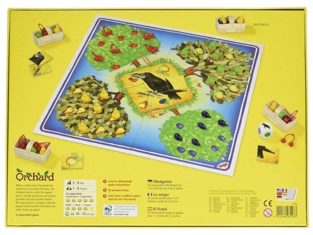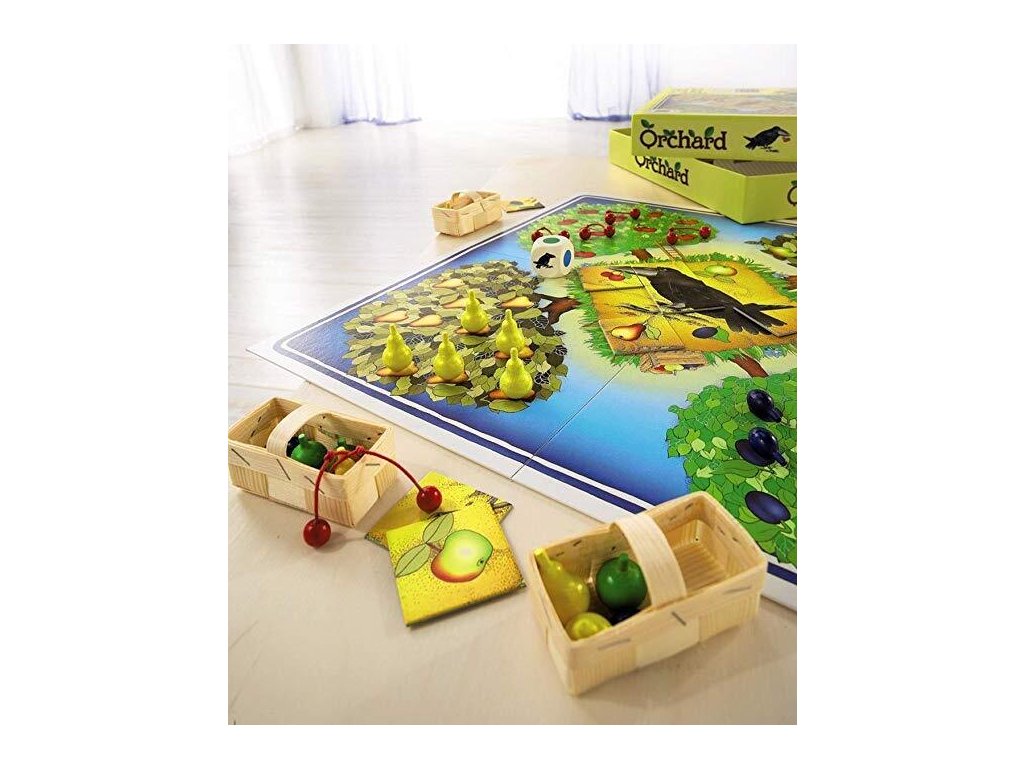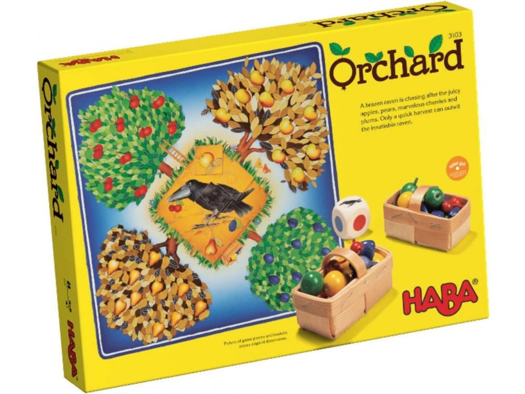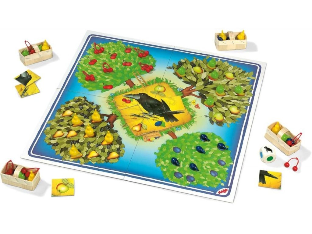 Obsah balenia: 10 jabĺk, 10 hrušiek, 10 párov čerešní, 10 sliviek, 4 koše, 1 skladačka havrana z 8 ks, 1 farebná kocka so symbolmi, 1 hracia doska, pravidlá.