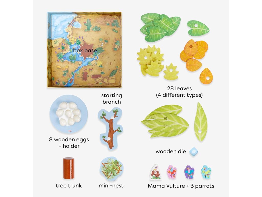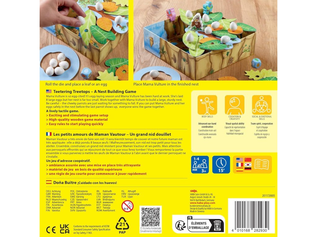 OPERATÍVNA HRA PRE DETI: Teetering Treetops je spoločná skladacia hra, v ktorej deti spoločne vytvárajú hniezdo pre mamu supicu a jej vajíčka. Skvelé hry pre 3-ročné deti na podporu spolupráce.Vzrušujúca rodinná hra – Balančná výzva: V tejto zábavnej rodinnej hre hráči opatrne ukladajú listy, vajíčka a vetvičky, čím si overujú svoje zručnosti a tímovú prácu, aby sa vyhli otravným papagájom, ktoré chcú zhodiť hniezdo.Krásne navrhnuté herné komponenty s vtáčou tematikou: Tieto detské spoločenské hry sú vyrobené z kvalitných drevených dielikov a majú zábavnú stavbu stromčeka, vďaka čomu sú skvelým darčekom pre batoľatá aj staršie deti, ktorý vydrží dlho.Rýchle a ľahko sa naučiteľné staviteľské hry: Vďaka jednoduchým pravidlám a rýchlemu hraniu sú tieto detské spoločenské hry ideálne pre deti a rodiny, ktoré hľadajú jedinečné a pútavé spoločenské hry.Zvyšuje kľúčové zručnosti: Podporuje riešenie problémov, koordináciu oko-ruka a spoluprácu vytváraním zábavných hier, ktoré sú zároveň skvelými vzdelávacími a vzdelávacími hračkami a hrami na ihrisku v triede.