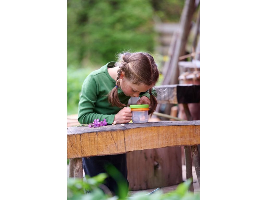 Mladší prieskumníci si môžu zblízka prezrieť listy, kvety, chrobáky, slimáky atď., žasnúť nad nimi a pozorovať ich – vo vnútri nádoby na poháre alebo na zemi.