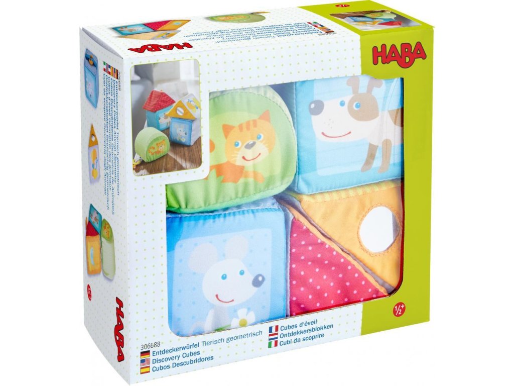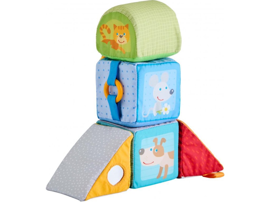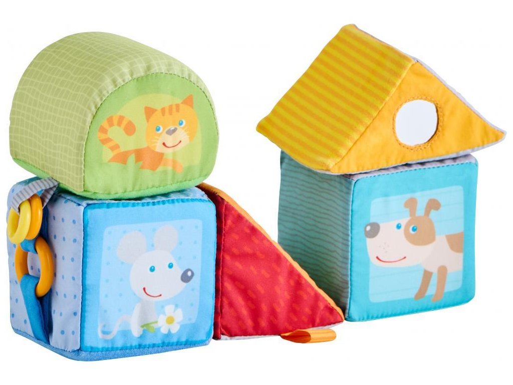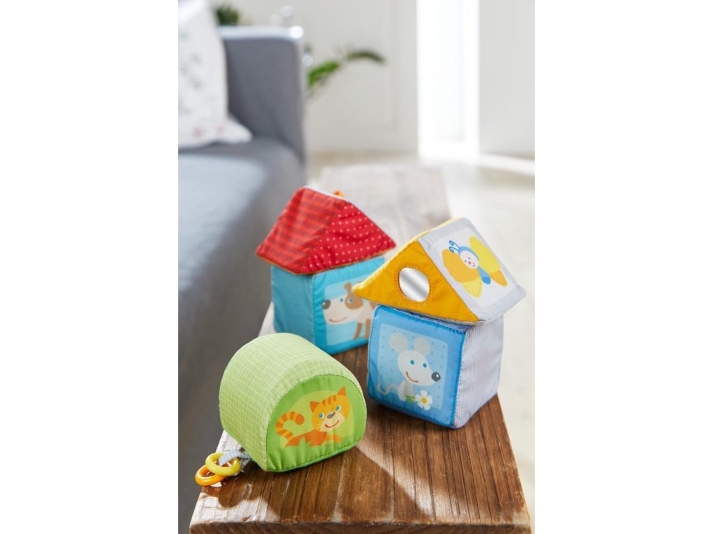 Päť krásnych textilných kociek plných objavov na rozvoj zmyslov pre najmenšie detičky - detičky môžu počúvať zvuky, rozoznávať farby a zvieratká, dotýkať sa a rozvíjať tak svoj hmat!