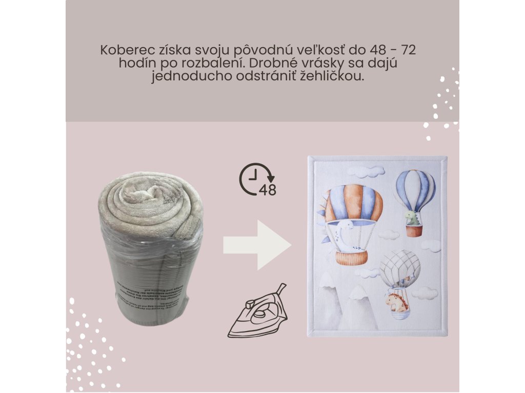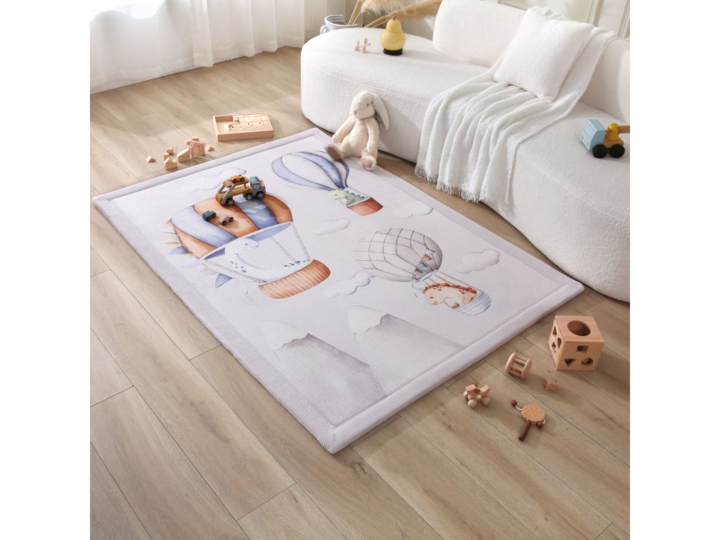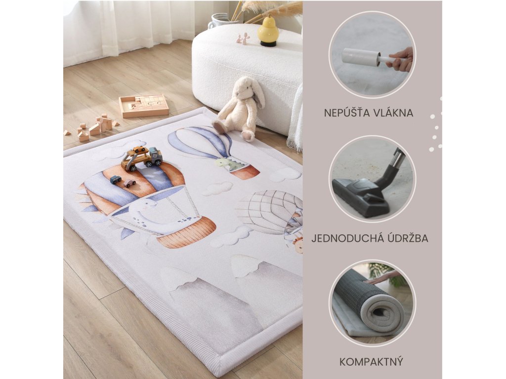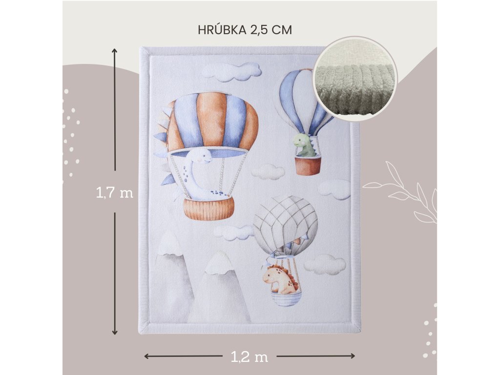 Detský koberec Dinosaur Balloons 1.7 x 1.2 m Bezpečné a pohodlné miesto na hranie Detský koberec Dinosaur Balloons je skvelým miestom pre deti na hranie, lezenie aj oddych. Má tri vrstvy – mäkký koralový zamat, pohodlnú elastickú pamäťovú penu a protišmykovú podložku, ktoré zaručia bezpečné a pohodlné hranie na zemi. Pamäťová pena je hrubá 2 cm a rýchlo sa vracia do pôvodného tvaru, čo je výhodou oproti lacnejším kobercom. S rozmermi 170 x 120 x 2 cm je dostatočne veľký nielen na detské hry, ale aj na jogu alebo relax.Štýlový a praktický doplnok do domácnosti Detský koberec s motívom dinosaurov v balóne krásne doplní váš interiér. Jeho praktický dizajn umožňuje jednoduchú starostlivosť a ľahkú údržbu – stačí ho povysávať alebo utrieť vlhkou handričkou. Navyše, je vyrobený bez škodlivých látok ako sú BPA či ftaláty, takže si môžete byť istí, že vaše dieťa bude v bezpečí.