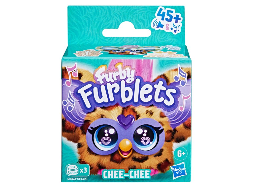 Roztomilý Furby Furblet Chee-Chee vyzerá ako malinký gepard s veľkou osobnosťou. S touto mini interaktívnou hračkou môžete objavovať celý rad zábavných zvukových a hudobných efektov. Furby Furblet Chee-Chee hrá veselú hudbu a hovorí rôzne frázy v jedinečnom jazyku zvanom Furbish (Furblets nepoznajú ľudskú reč). Stlačením zobáka sa ozvú zábavné zvuky kŕmenia a kliknutím na srdiečkový drahokam sa spustí hudba. Stlačením hornej časti hlavy sa aktivujú zábavné frázy v jazyku Furbish a funkcie on/off. Furblets sú v rôznych farbách a s rôznymi hudobnými štýlmi. Nazbieraj ich viac a nechaj ich spievať spoločne. Pripnite si Chee-Chee k batohu alebo inej cestovnej taške pomocou klipu na kľúče a vezmite ho na párty kamkoľvek so sebou. Klip je odnímateľný. Funguje na gombíkové batérie 3 x LR44, ktoré sú súčasťou balenia. Ak máte väčšiu interaktívnu hračku Furbyho, aktivujte režim Furdar a pozrite sa, čo Furby hovorí o svojich malých kamarátoch Furblets. Elektronická plyšová hračka je vhodná pre dievčatá a chlapcov od 6 rokov a je zábavným spoločníkom, ktorého môžu mať deti vždy po svojom boku. Balené v krabičke. Rozmery balenia: 12,7 x 9,5 x 5,4 cm. Vek: 6+