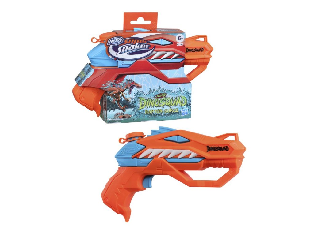 Rozbaľte to s vodnými bl8strami Nerf Super Soaker! Tieto vonkajšie hračky nie sú len pre deti, skvele sa s nimi vyšantia aj dospelí. Rozšírte rady elitnej jednotky DinoSquad a spojte sily s legendárnymi dinosaurami! Využite mimoriadnu silu dinosaurích titánov a zažite s nimi úžasné dobrodružstvá! Vodný bláster Nerf DinoSquad Raptor-Surge zachytáva vzhľad dinosaura Velociraptora a je prísľubom skutočne divokej letnej zábavy. Prúd vody tryská priamo z dinosaurej papule. Otvorte uzáver, naplňte zásobník vodou, zatvorte uzáver a stlačením spúšte vypustíte silný prúd vody.