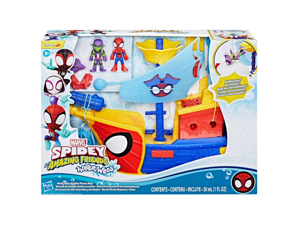 Deti si môžu predstaviť dobrodružstvo na mori s hracou sadou Spidey and his Amazing Friends – Pirátska loď Webs Ahoy s bublinkami. Hracia sada obsahuje pascu na bubliny, otočný stožiar a pozorovateľňu, vysúvateľnú dosku a ďalšie prvky. Súprava obsahuje pohyblivé figúrky superhrdinov Spideyho a Green Goblina vo veľkosti 7,6 cm s odnímateľnými doplnkami – vrátane: 2 pirátskych klobúkov, 1 páru pirátskych topánok, truhlice s pokladom, mapy, fľaštičky s bublinkovou tekutinou a ďalších doplnkov. Po použití stačí pirátsku loď s bublinkami jednoducho opláchnuť a dôkladne vysušiť (podrobnosti pozri návod). Obsahuje: 2 figúrky, loď, 9 doplnkov a bublinkový roztok 30 ml. Vyrobené z kvalitného plastu. Balené v krabičke. Rozmery balenia: 34,3 x 45,7 x 13,5 cm. Vek: 3+