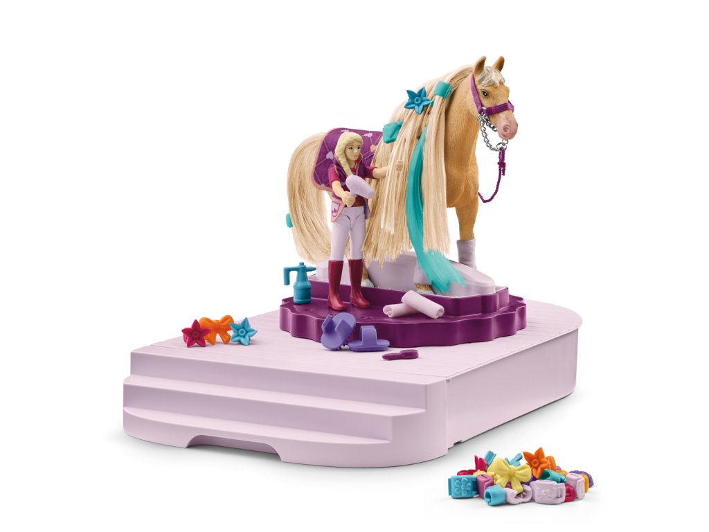 Wellness starostlivosti v hrebelcovacej stanici ide tak dobre, že sa koňovi ani nechce preč. Výstavný kôň si hrebelcovanie a umývanie hubkou vážne užíva. Aby hriva a chvost rýchlejšie uschli, máš v šuplíku po ruke fén. A teraz môžeš začať so stylingom. Svojmu koňovi môžeš do hrivy pripnúť koráliky, mašle alebo kvety, prípadne mu môžeš pripnúť ďalší prameň do hrivy. Aby všetci vedeli, že sú nerozlučná dvojka, majú kôň aj jazdec rovnaké doplnky. Deka a vesta majú rovnaký vzor a dokonca aj návleky ladia s páskou na ruku. Rozmery: 28x22,9x11cm. Vhodné pre deti od 3 rokov.