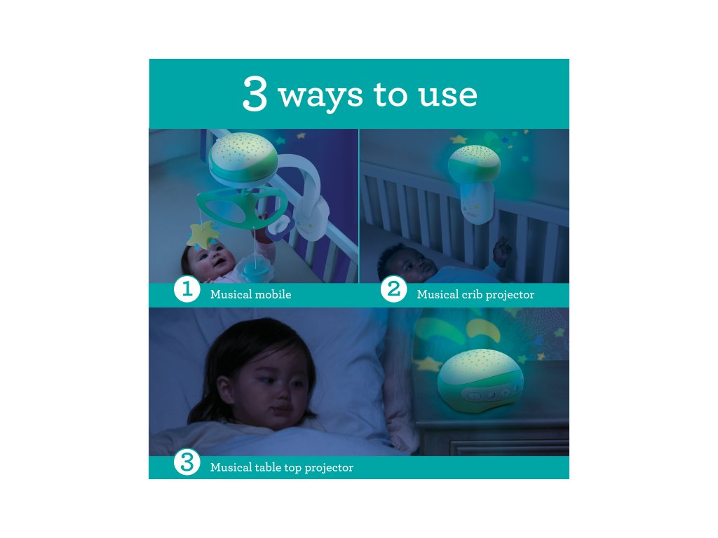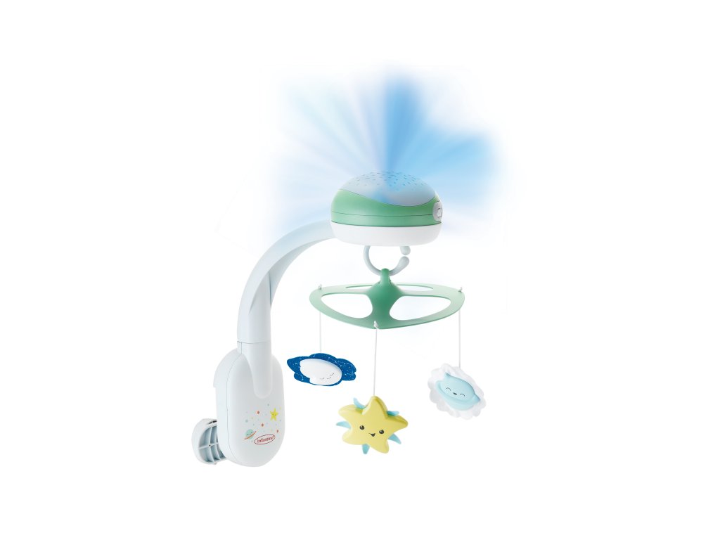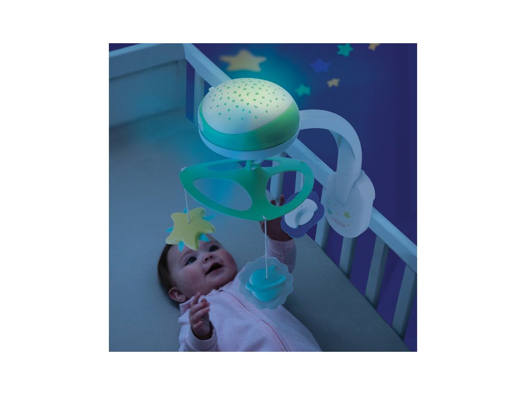 Svetelný projektor premieta na stenu či strop hviezdičky a jemne tak osvieti detskú izbu. Spolu s upokojujúcou melódiou pomôže vášmu dieťaťu v pokoji zaspávať. Ponúka na výber z ôsmich upokojujúcich melódií a zvukov prírody. Melódie a prírodné zvuky kolotoč po zapnutí prehráva 20 minút, zvukový senzor prehrávania spustí znova, ak dieťa v priebehu dvoch hodín po zapnutí začne plakať.