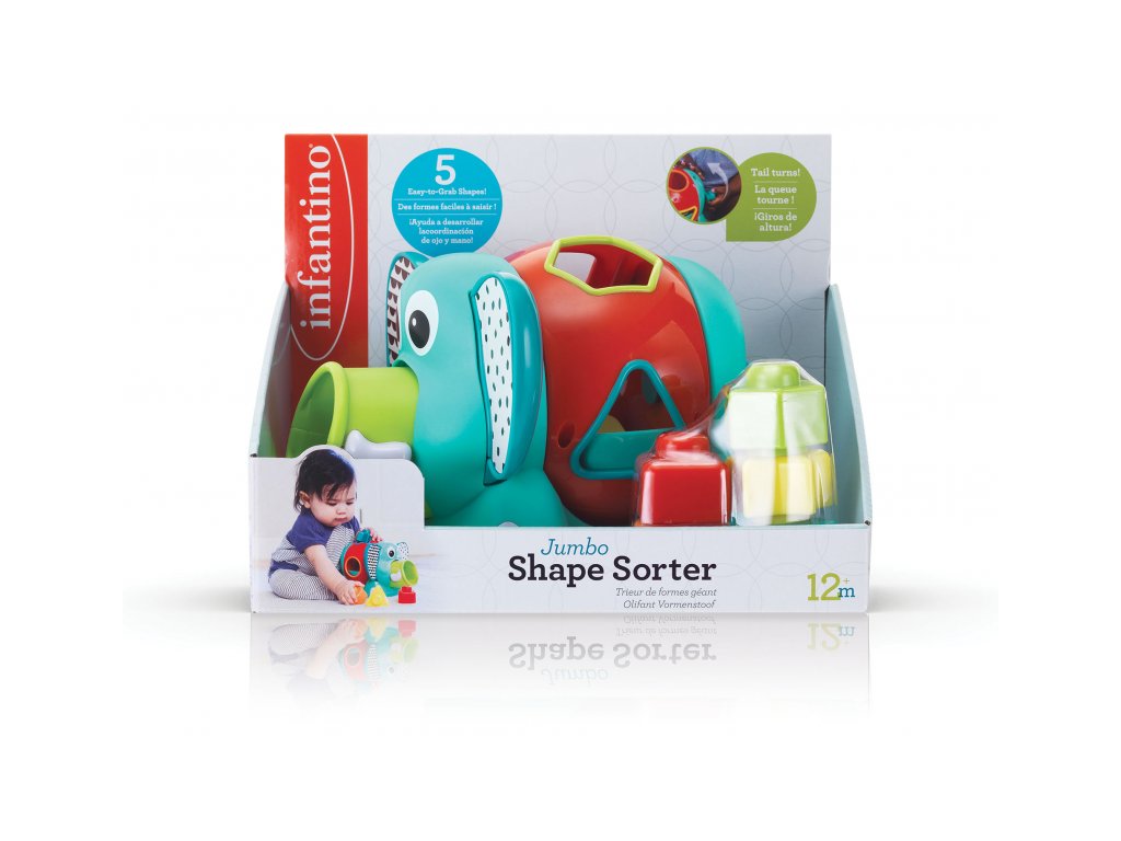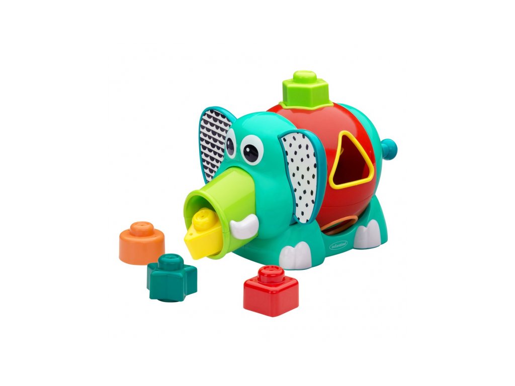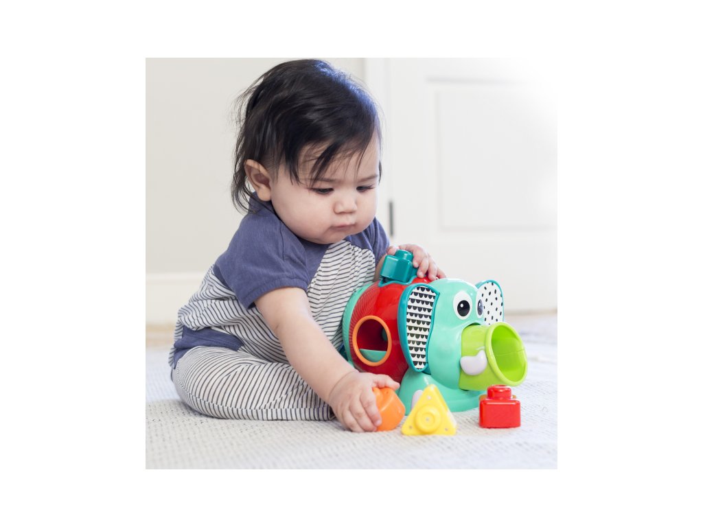 Rozkošný slon s rôznofarebnými vkladacími tvarmi. Pohyblivé uši a chobot aj otočné telo slona budú lákať dieťa na skúmanie.