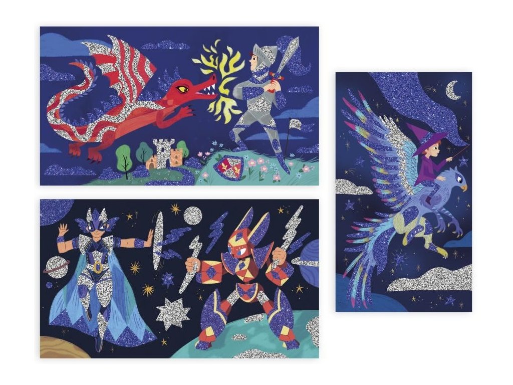Deti od 6 rokov budú môcť oživiť svojich obľúbených rozprávkových a kreslených hrdinov jednoduchým potiahnutím týchto 3 obrázkov v 2 rôznych farbách trblietok.