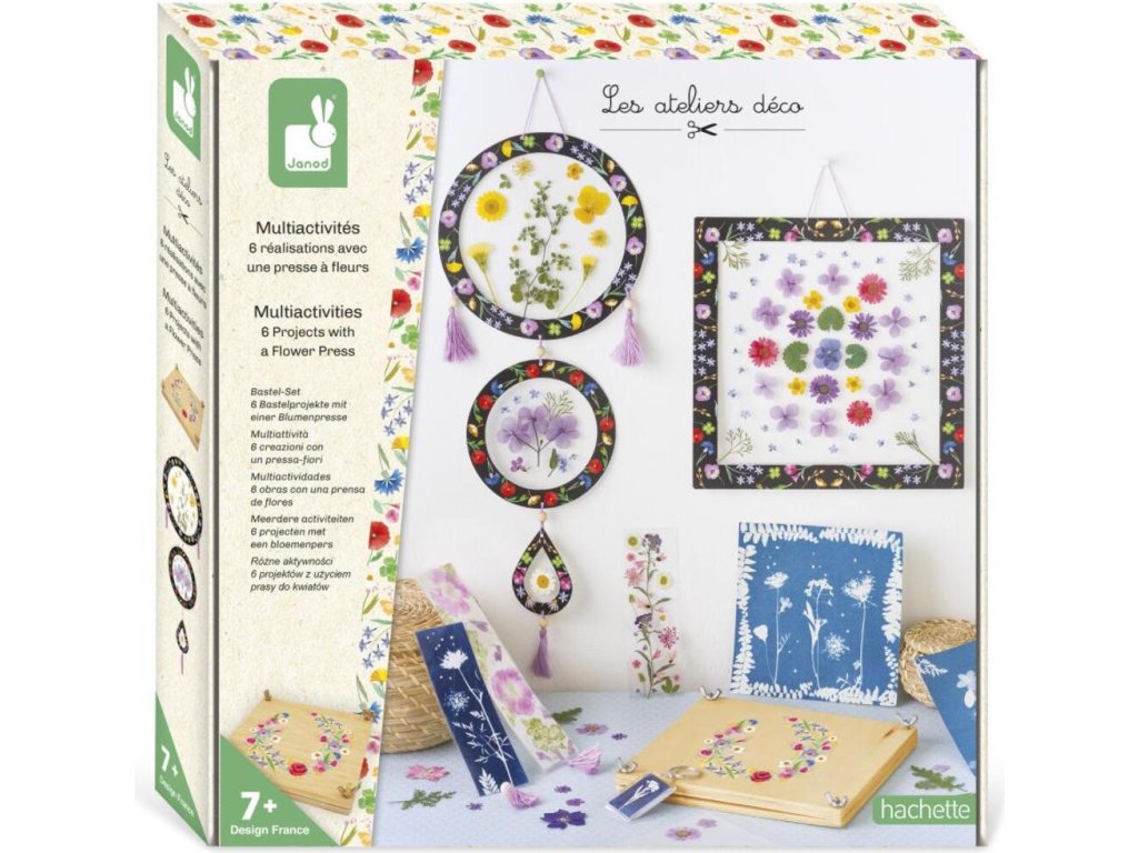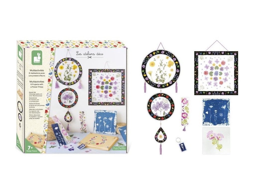 Vďaka tomuto krásnemu drevenému lisu na kvety si deti budú môcť vyrobiť: lapač snov, záložky, prívesok na kľúče, obrázky na slnečnom papieri (ktorý zvýrazňuje obrysy kvetov a listov) a obrázky Hape Zome (technika tlače).