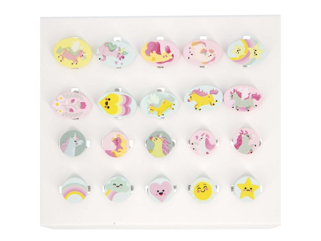 Skladá sa z 20 drevených krúžkov, všetky s motívom jednorožca! 10 prsteňov je okrúhlych a ďalších 10 oválnych: pre každého je niečo!