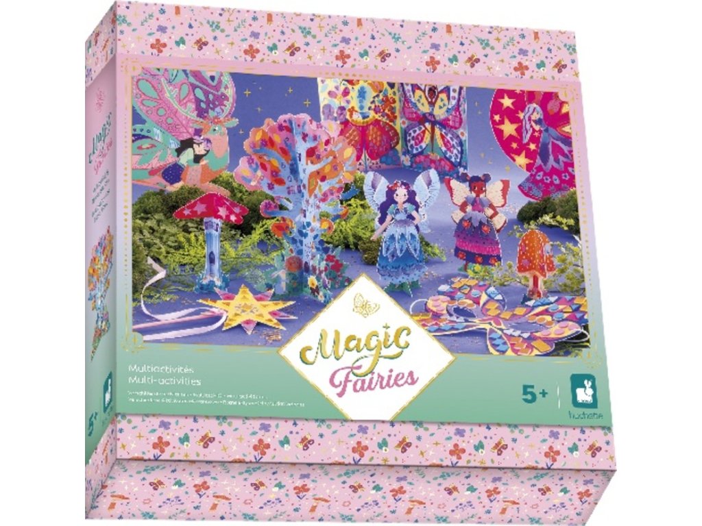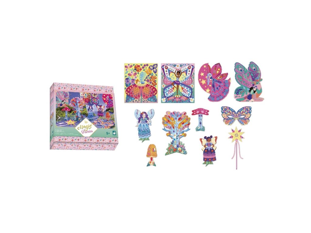 Objavte rozprávkový svet malých víl! Z obsahu tejto pevnej krabičky s krásnou potlačou môžete vytvoriť rôzne dekorácie: mozaikové obrázky, 3D víly, masku, čarovnú paličku, vyškrabkať obrázok, 2 hríbiky a 3D stromček. Obsahuje: 3 predrezané ilustrované dosky, 1 predrezaný ilustrovaný list papiera, 2 škrabadlá, 2 obrázky na zdobenie, 1 masku, 1 prútik, 6 listov penovej mozaiky s pozláteným vzhľadom, 2 listy metalických nálepiek, 1 kus gumy, 1 saténová stuha, 1 obojstranná samolepiaca penová doska a 1 brožúra s návodom a vzormi. Táto aktivita pomáha deťom rozvíjať trpezlivosť a kreativitu a jej dokončenie zaberie celkovo 2 hodiny. Je ideálna pre deti od 5 rokov.