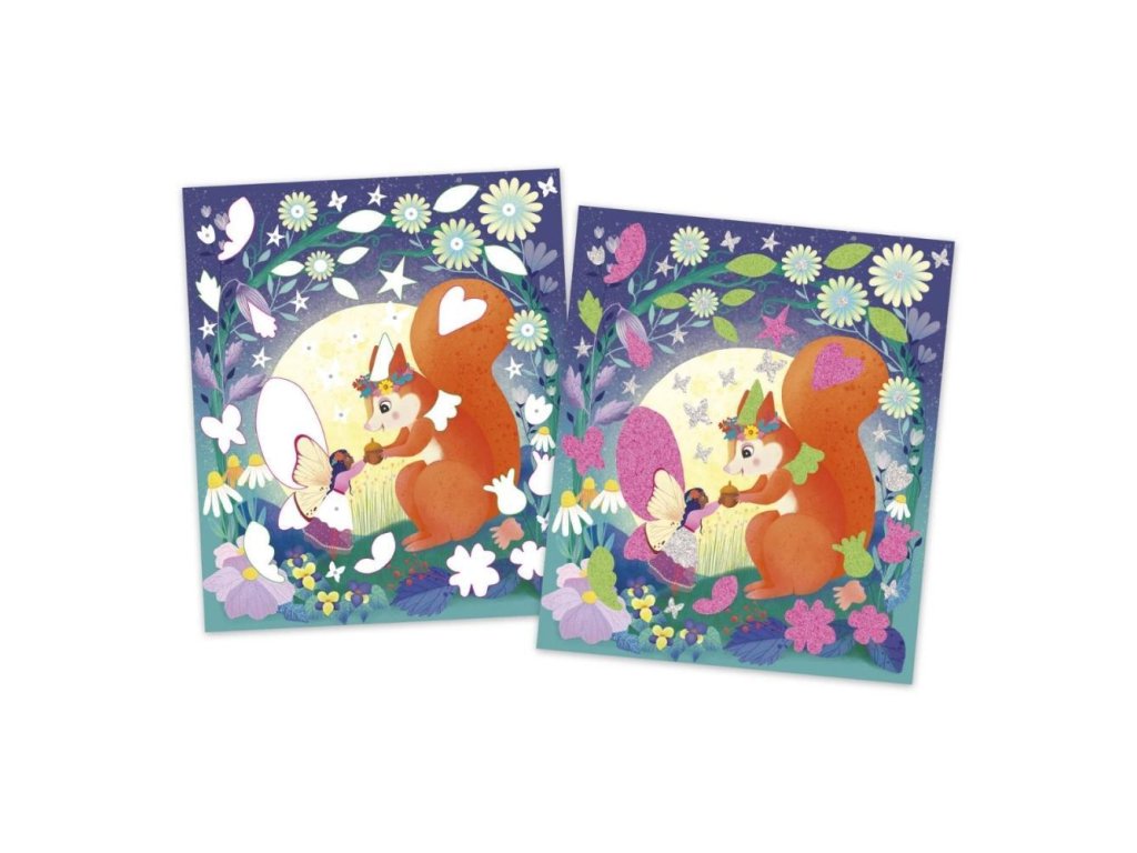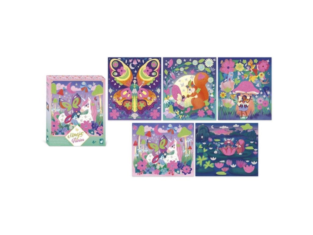 Princíp tejto sady je jednoduchý: odlepte fóliu z penových nálepiek a zasypte ich pieskom, čím vytvoríte nálepky s atraktívnym reliéfnym efektom. Potom odstráňte pieskové nálepky z papiera a umiestnite ich na príslušné miesta obrázku. Pre ešte väčší lesk pridávame trblietavé nálepky! Pomaly sa obrázky rozsvietia: v rozprávkovej záhrade žijú najmenšie a najmajestátnejšie zvieratá v súlade s rytmom prírody. Vďaka tejto sade si deti môžu vychutnať pokojnú aktivitu v úplnom kľude, bez obrazoviek a naplno prejaviť svoju kreativitu! Kombinácia embosovaných penových nálepiek, pútavých farieb a trblietok dodáva ilustráciám očarujúci vzhľad. Zdobenie každého obrázka trvá približne 10 minút. Strávte teda pokojný čas v rozprávkovom lese! Objavte svet kolekcie "Magic Fairies", radu jemne kvetinových, kreatívnych sád na hobby a workshopy pre deti s tematikou rozprávok. Pre snové tvorivé popoludnia!