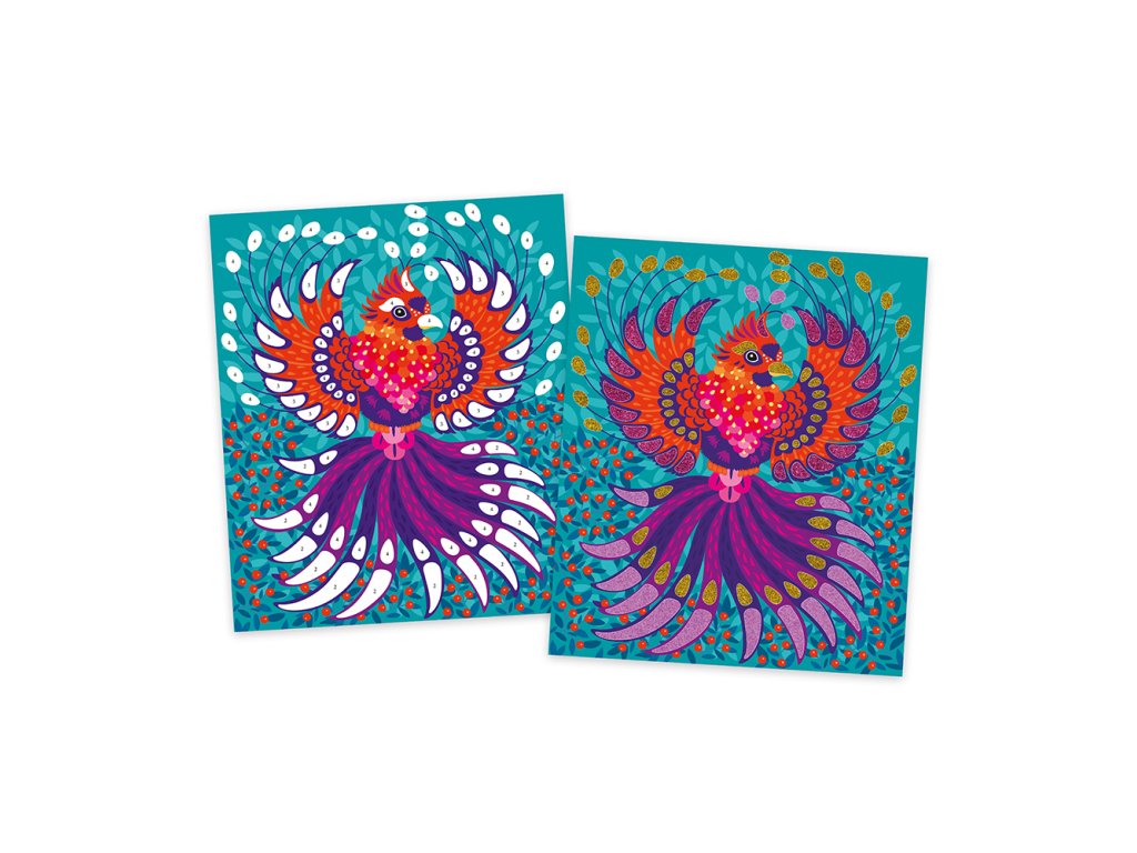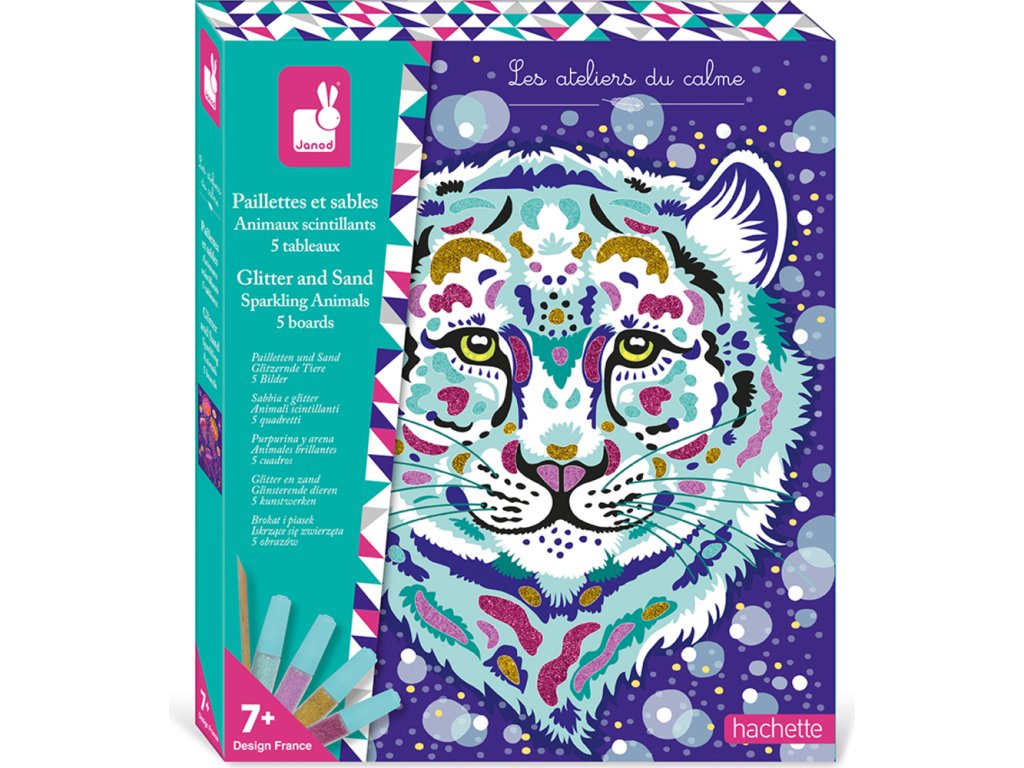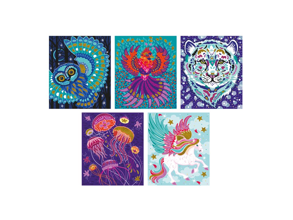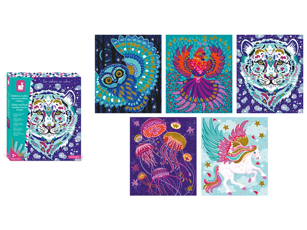 Príďte sa stretnúť s majestátnym tigrom, fantastickým jednorožcom alebo hypnotickou sovou! Táto kreatívna sada obsahuje 5 obrázkov na ozdobenie pieskom a trblietkami. Obsahuje: 5 samolepiacich tabúľ, 2 tuby s biologicky odbúrateľnými trblietkami, 2 tuby piesku, 1 drevenú pomôcku a 1 brožúru s návodom a dizajnom. Táto aktivita pomáha rozvíjať trpezlivosť a kreativitu a vyžaduje si približne 30 minút na jeden obrázok. Je ideálny pre deti od 7 rokov.