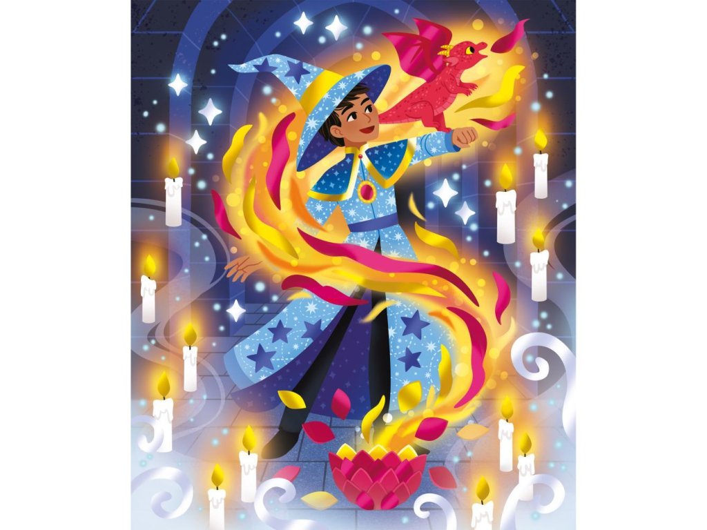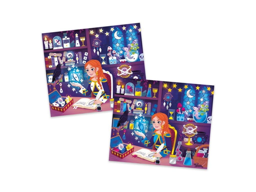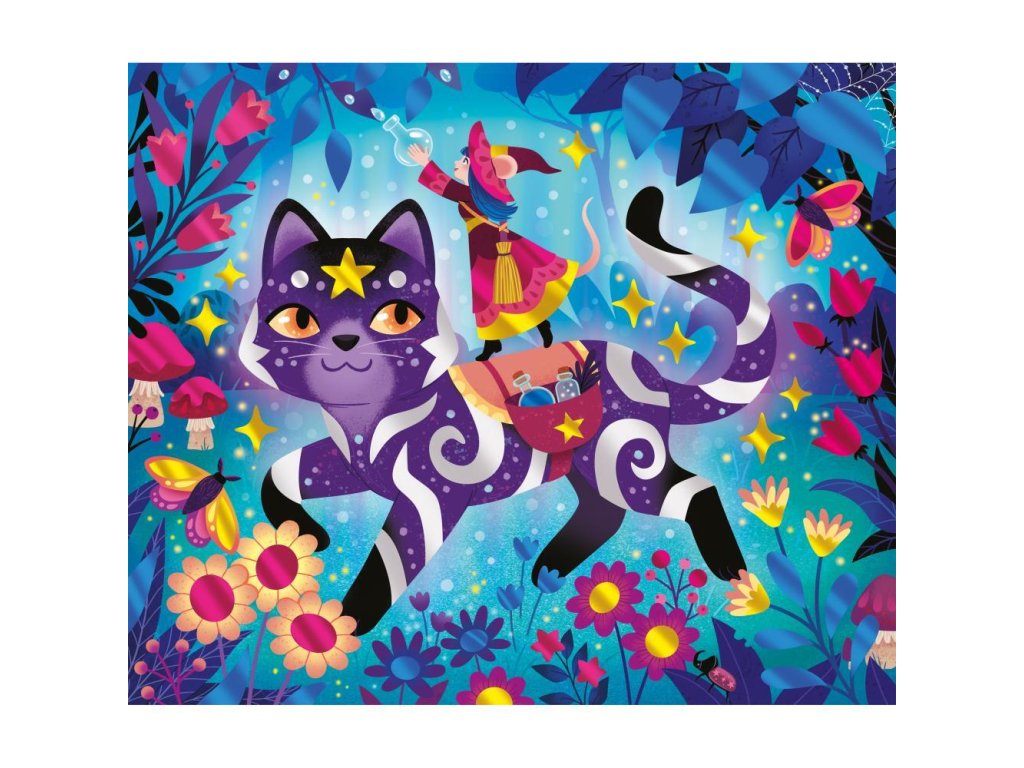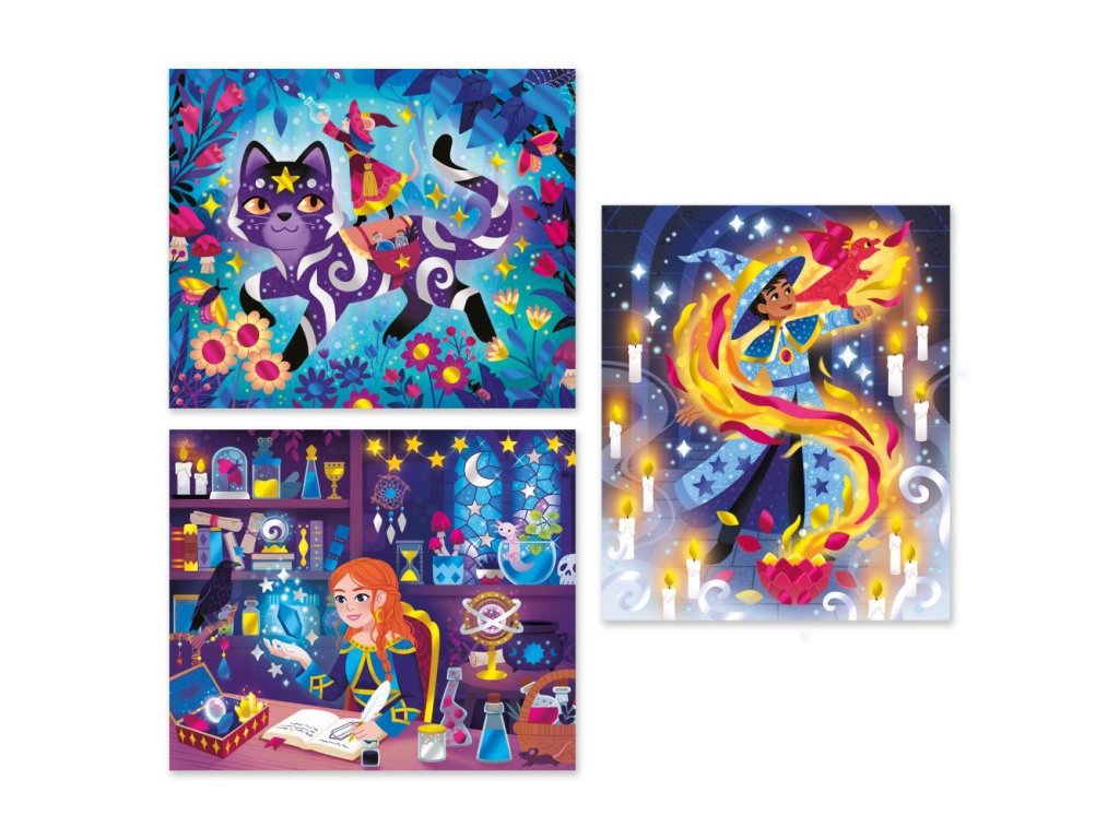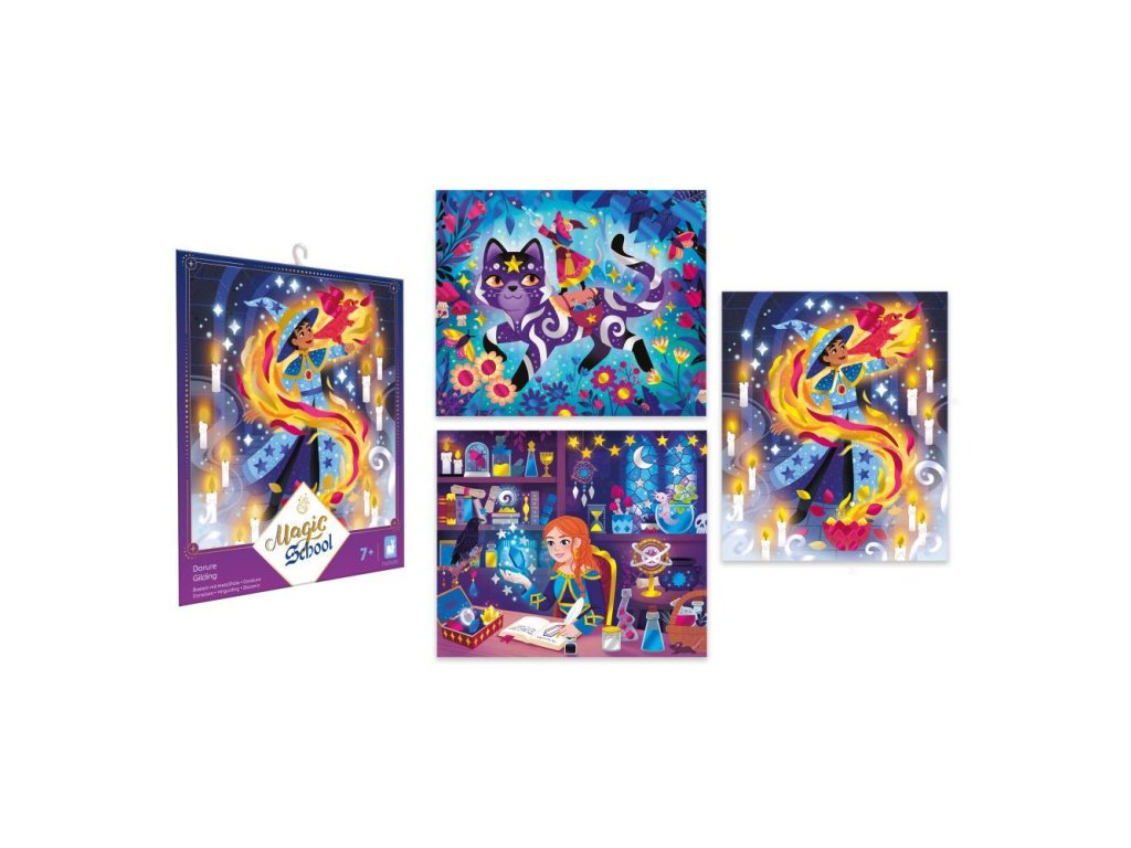Na tému čarodejnice a kúzelníci je táto tvorivá činnosť ideálna na rozvíjanie trpezlivosti a precíznosti. Na dodanie krásnych zlatých odtieňov obrazom nemôže byť nič jednoduchšie: obrazy sú samolepiace a súčasťou balenia sú kovové plechy, ktoré vyplnia každý detail ilustrácií. Kabinet kuriozít, fantastické zvieratá, lekcie kúziel... V čarodejníckej škole je mágia všade!