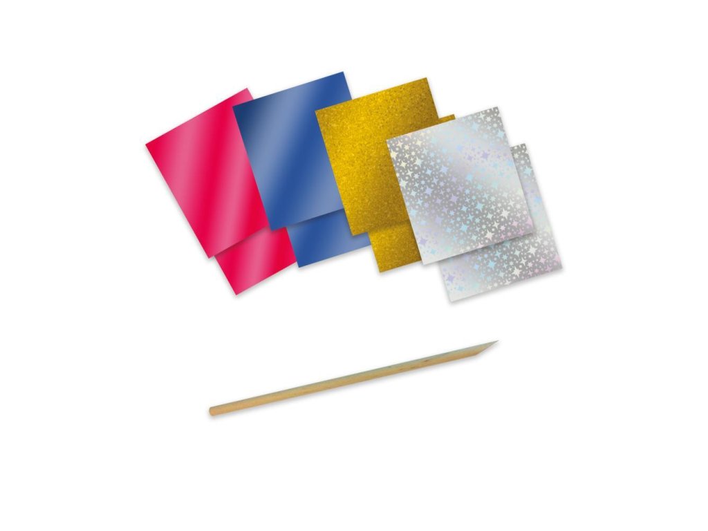 3 samolepiace dosky, 8 kovových plátov, 1 drevený nástroj.