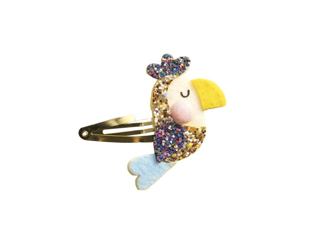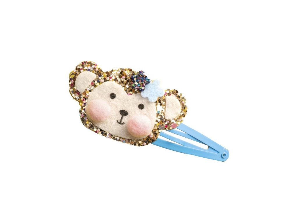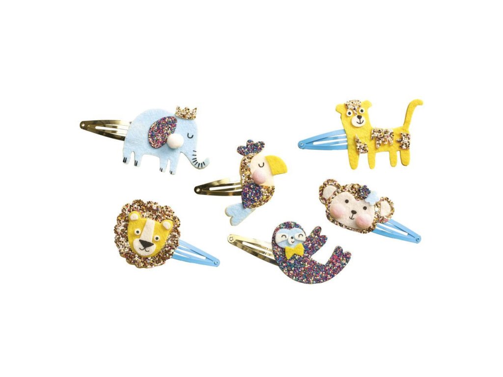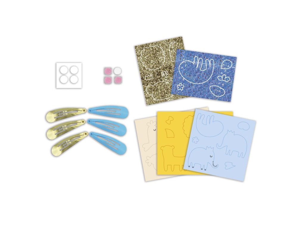 Poďme do džungle! Vďake tejto kreatívnej sade si vyrobíte 6 trblietavých sponiek do vlasov s motívom zvierat z džungle: slona, leva, leoparda, tukana, leňochoda a opice.