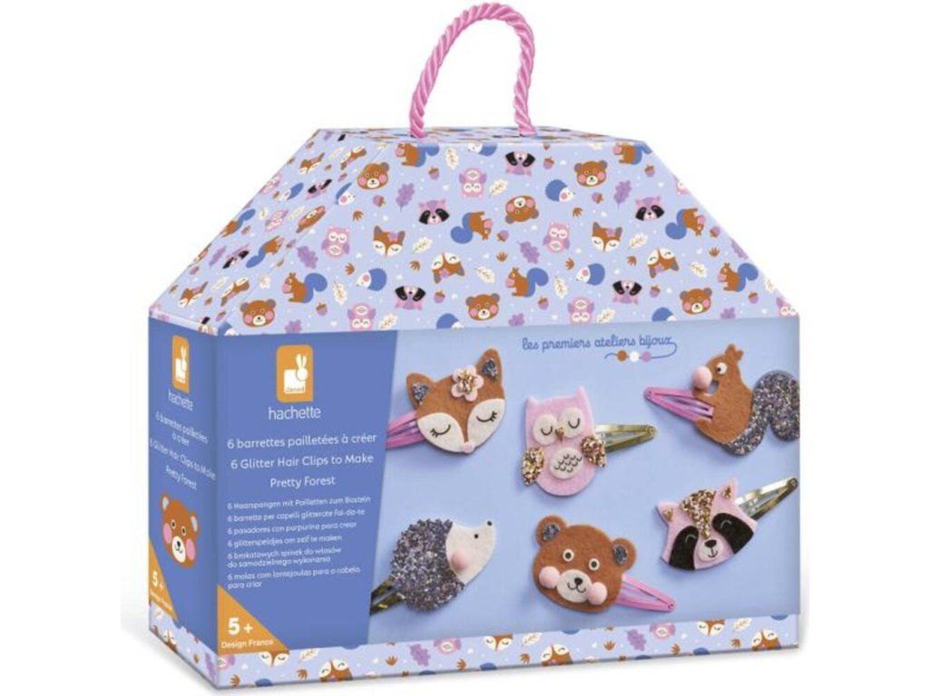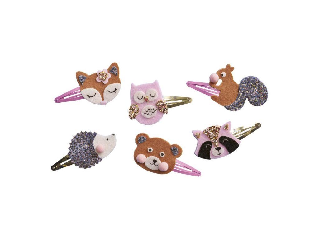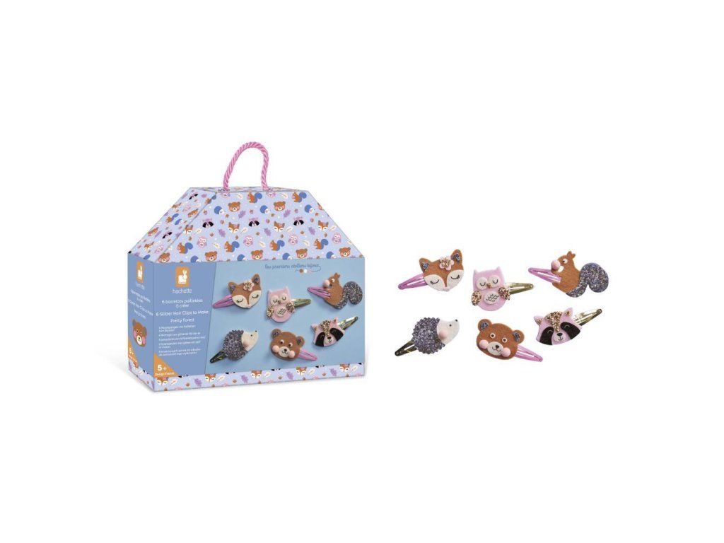 Tento kreatívny box vám umožní vyrobiť 6 trblietavých barretiek v tvare lesných zvieratiek: líšku, sovu, ježka, medveďa, mývala a veveričku.