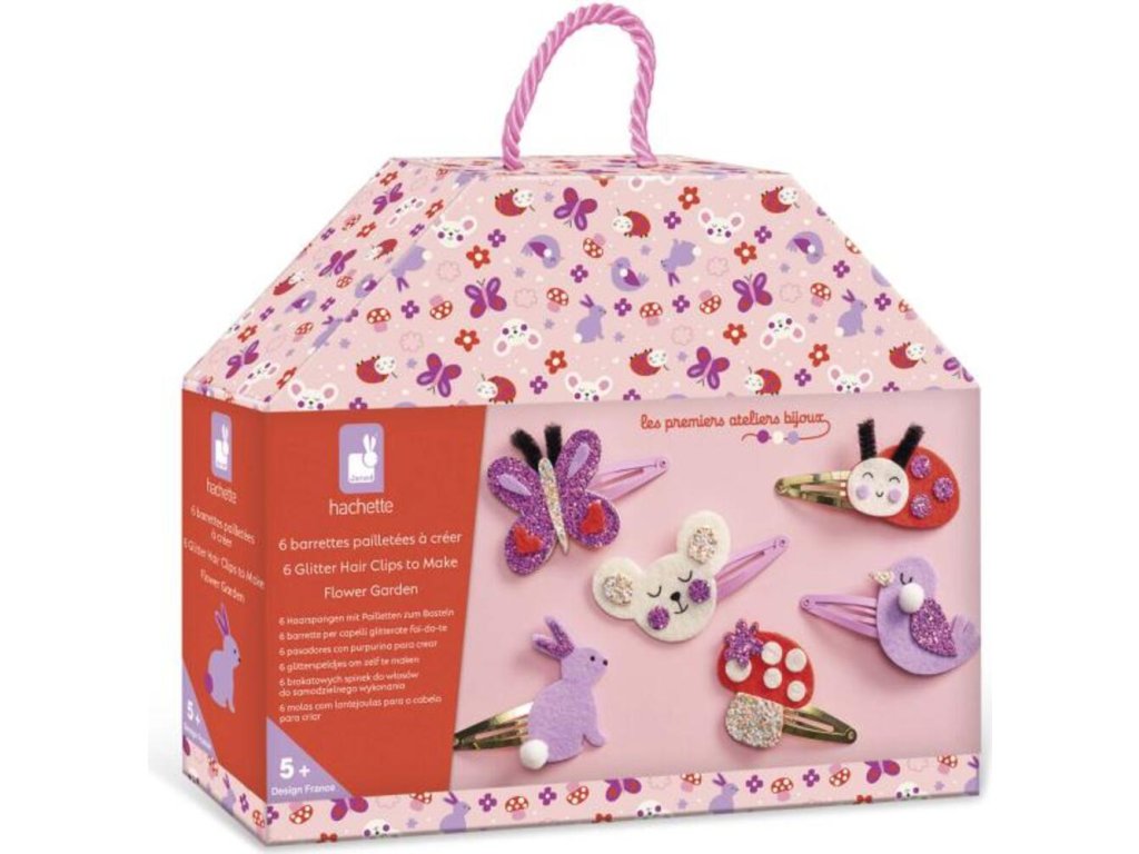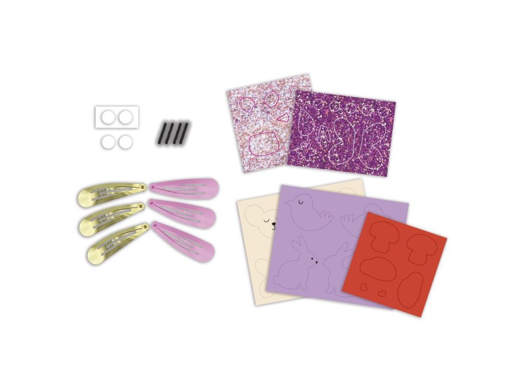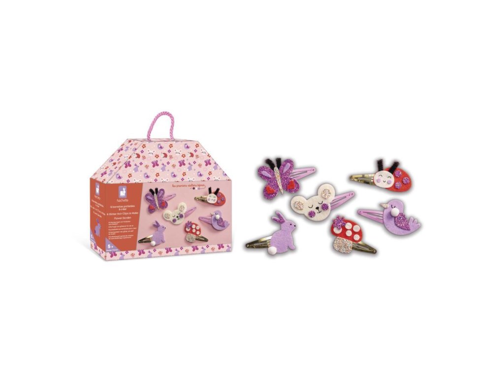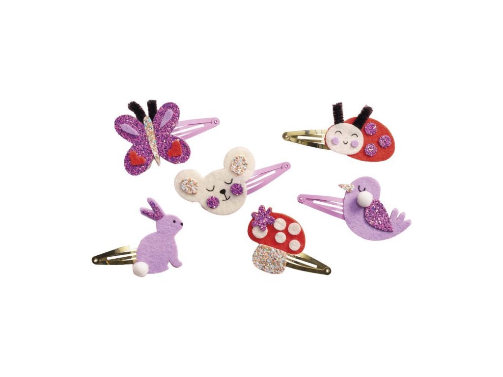 Kvetinová záhrada! Z tejto kreatívnej sady môžete vyrobiť 6 trblietavých sponiek do vlasov s motívom obyvateľov záhrady: pekného motýľa, lienky, zajačika, vtáčika, hríbika a myšky.