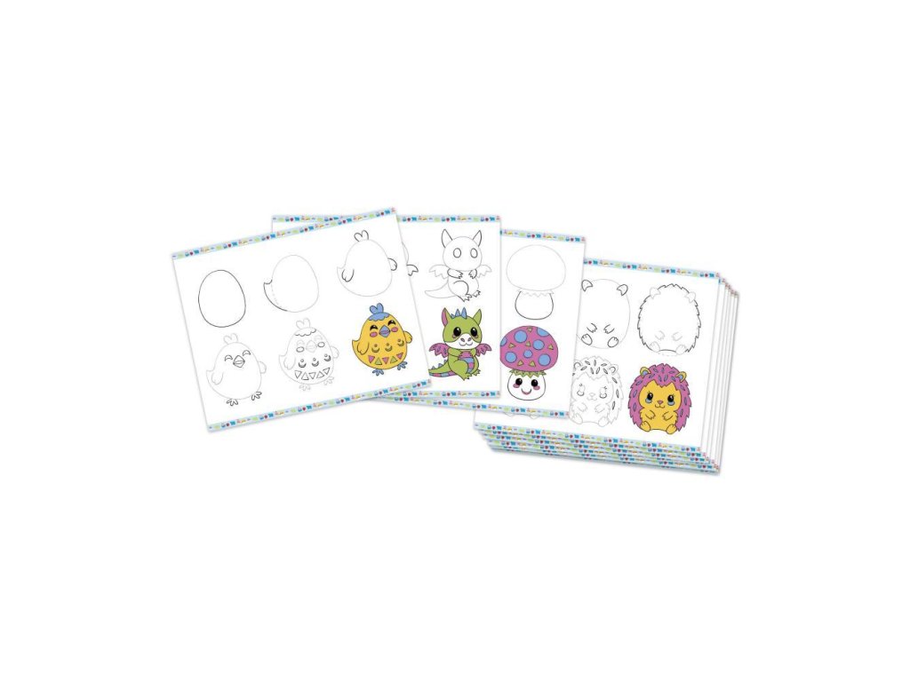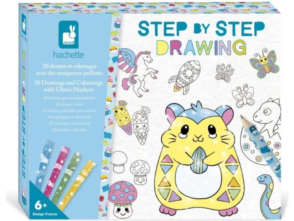 Kreatívna súprava na učenie sa kresliť krok za krokom od francúzskej značky JANOD. Obsahuje 20 kariet so vzormi krok za krokom, 25 prázdnych strán, ceruzku s gumou a 4 trblietavé fixky (ružové, modré, zelené a zlaté). Dieťa sa učí dopĺňaním nasledujúcich kresieb a ich vyfarbovaním. Potom ich môžete opakovane prehrávať na dodaných prázdnych hárkoch. Kresby, ktoré sa majú vytvoriť, zobrazujú zvieratá, dinosaury a veci v štýle kawaii, ktoré deti milujú. Učiť sa kresliť sú dlhé hodiny pútavej a zároveň upokojujúcej a ukľudňujúcej zábavy a hotové obrázky sa stanú nádherným dekoračným prvkom detskej izby.