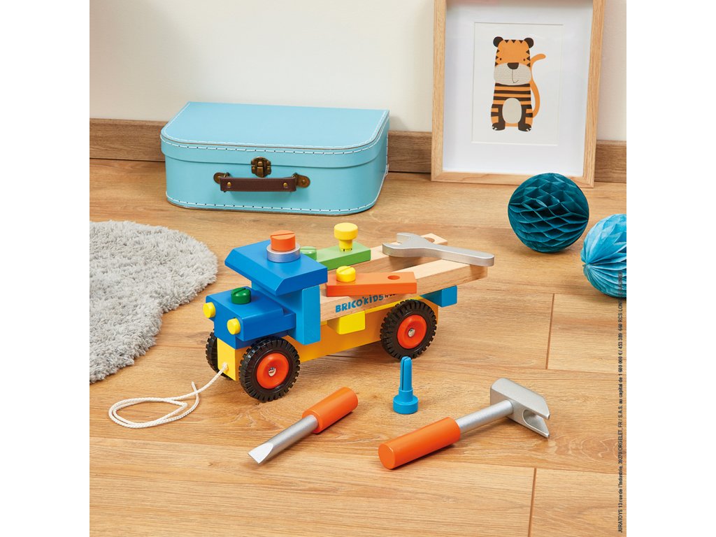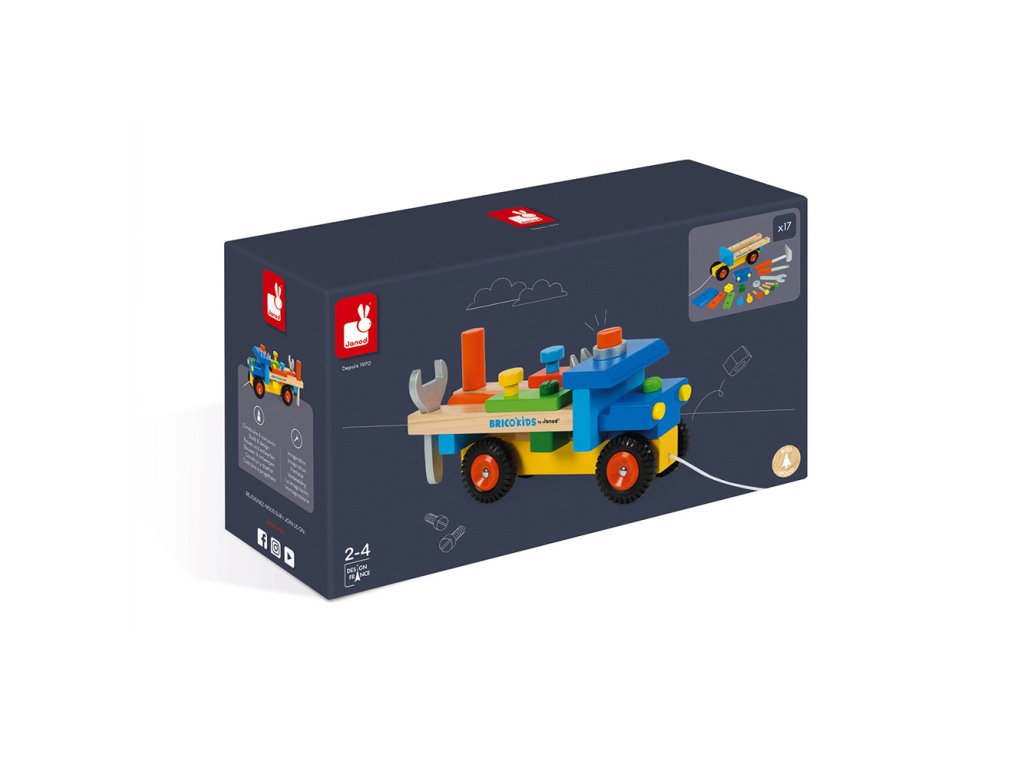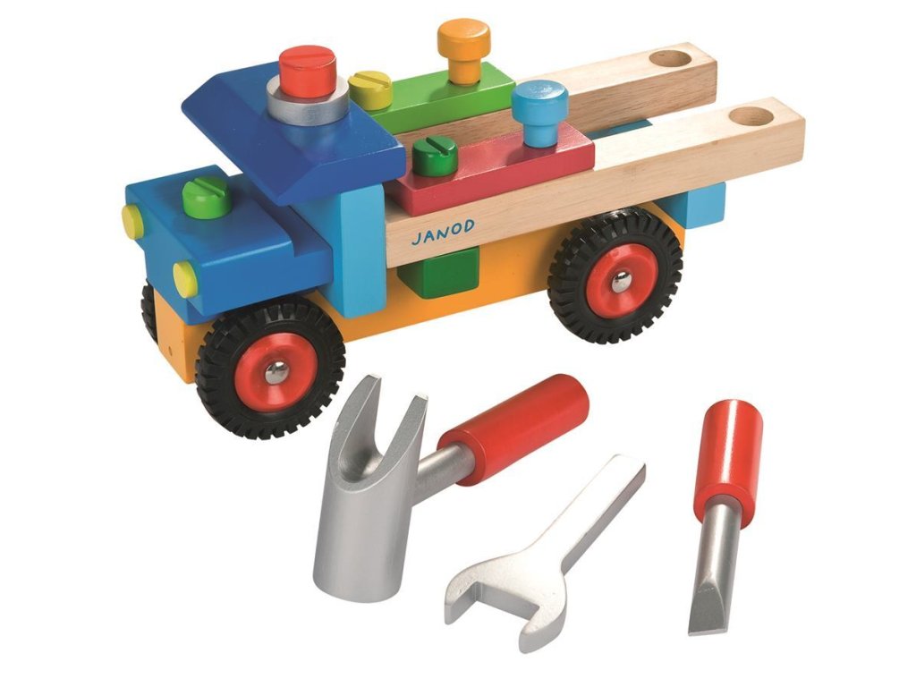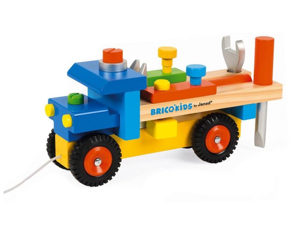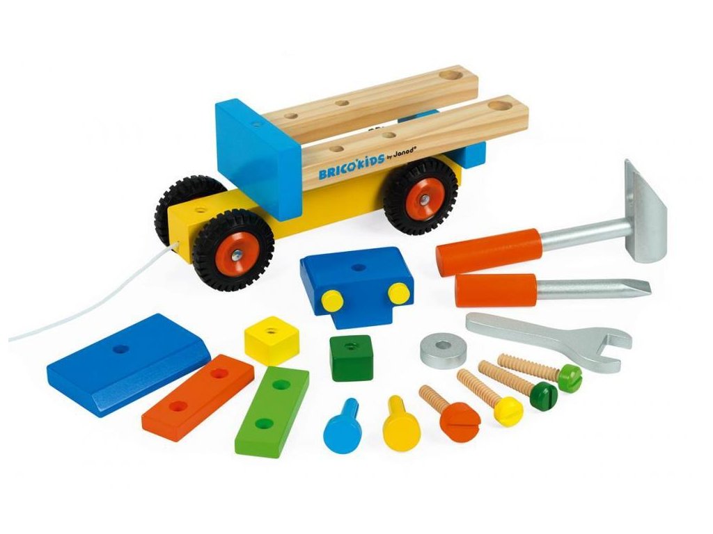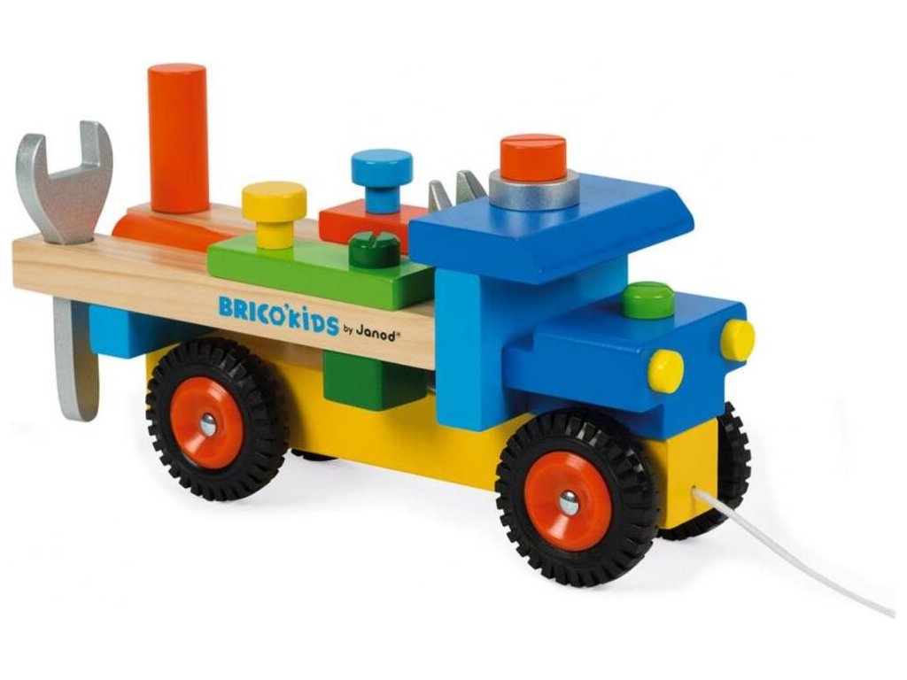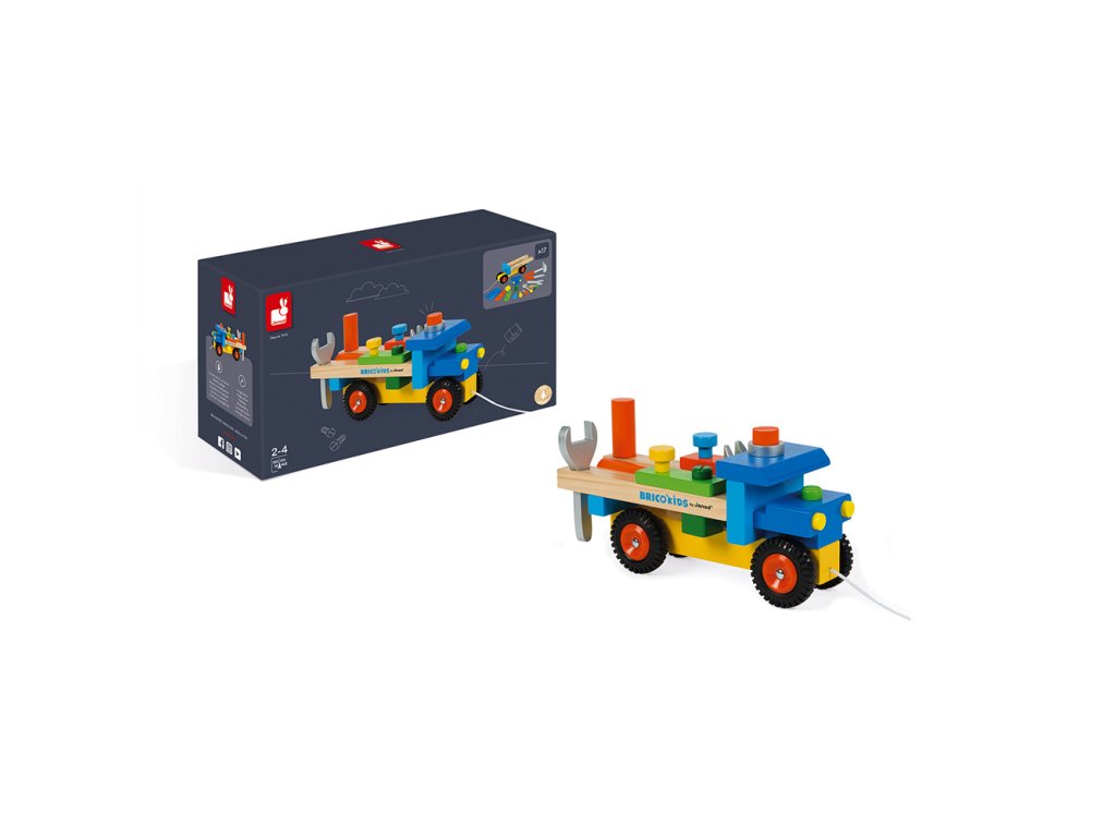 Janod Drevené auto a stavebnica pre chlapcov Kamión BricoKids má veselé farebné prevedenie a tvorí ho 17dielikov.